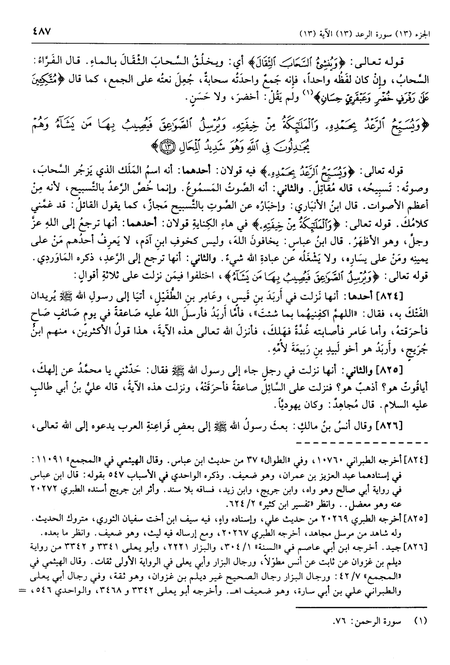 قوله تعالى: وَيُسَبِّحُ الرَّعْدُ بِحَمْدِهِ فيه قولان: أحدهما: أنه اسم الملَك الذي يزجر السحاب، وصوته: تسبيحه، قاله مقاتل. والثاني: أنه الصوت المسموع. وإِنما خُص الرعد بالتسبيح، لأنه من أعظم الأصوات. قال ابن الأنباري: وإِخباره عن الصوت بالتسبيح مجاز، كما يقول القائل: قد غمَّني كلامك. قوله تعالى: وَالْمَلائِكَةُ مِنْ خِيفَتِهِ في هاء الكناية قولان: أحدهما: أنها ترجع إلى الله عزّ وجلّ، وهو الأظهر. قال ابن عباس: يخافون الله، وليس كخوف ابن آدم، لا يعرف أحدهم مَنْ على يمينه ومَنْ على يساره، ولا يَشْغَله عن عبادة الله شيء. والثاني: أنها ترجع إِلى الرعد، ذكره الماوردي.