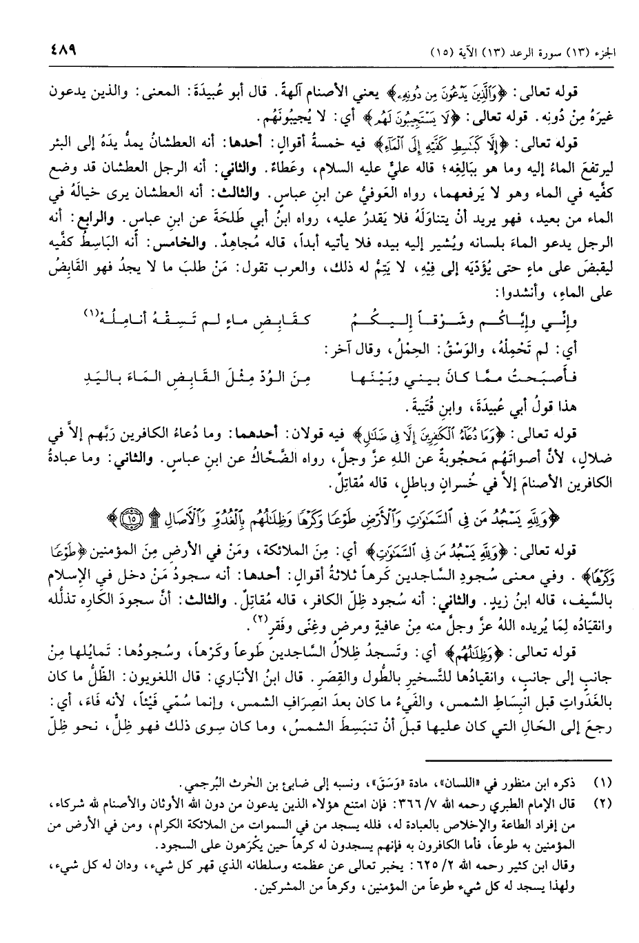 (2) قال الإمام الطبري رحمه الله 7/ 366: فإن امتنع هؤلاء الذين يدعون من دون الله الأوثان والأصنام لله شركاء، من إفراد الطاعة والإخلاص بالعبادة له، فلله يسجد من في السماوات من الملائكة الكرام، ومن في الأرض من المؤمنين به طوعا، فأما الكافرون به فإنهم يسجدون له كرها حين يكرهون على السجود.