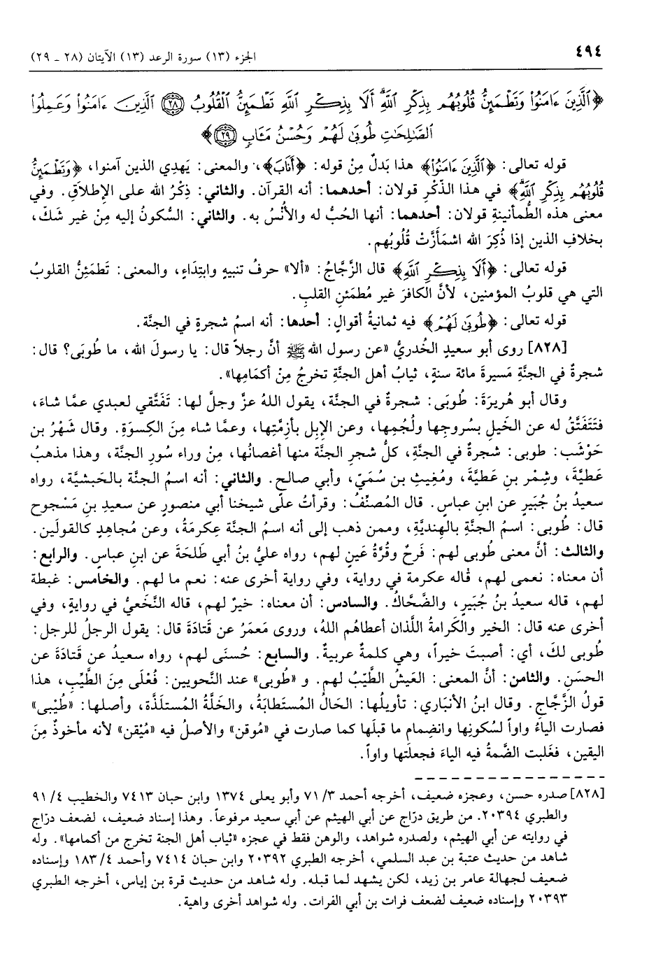 (828) روى أبو سعيد الخدري «عن رسول الله صلّى الله عليه وسلم أن رجلاً قال: يا رسول الله، ما طوبى؟ قال: