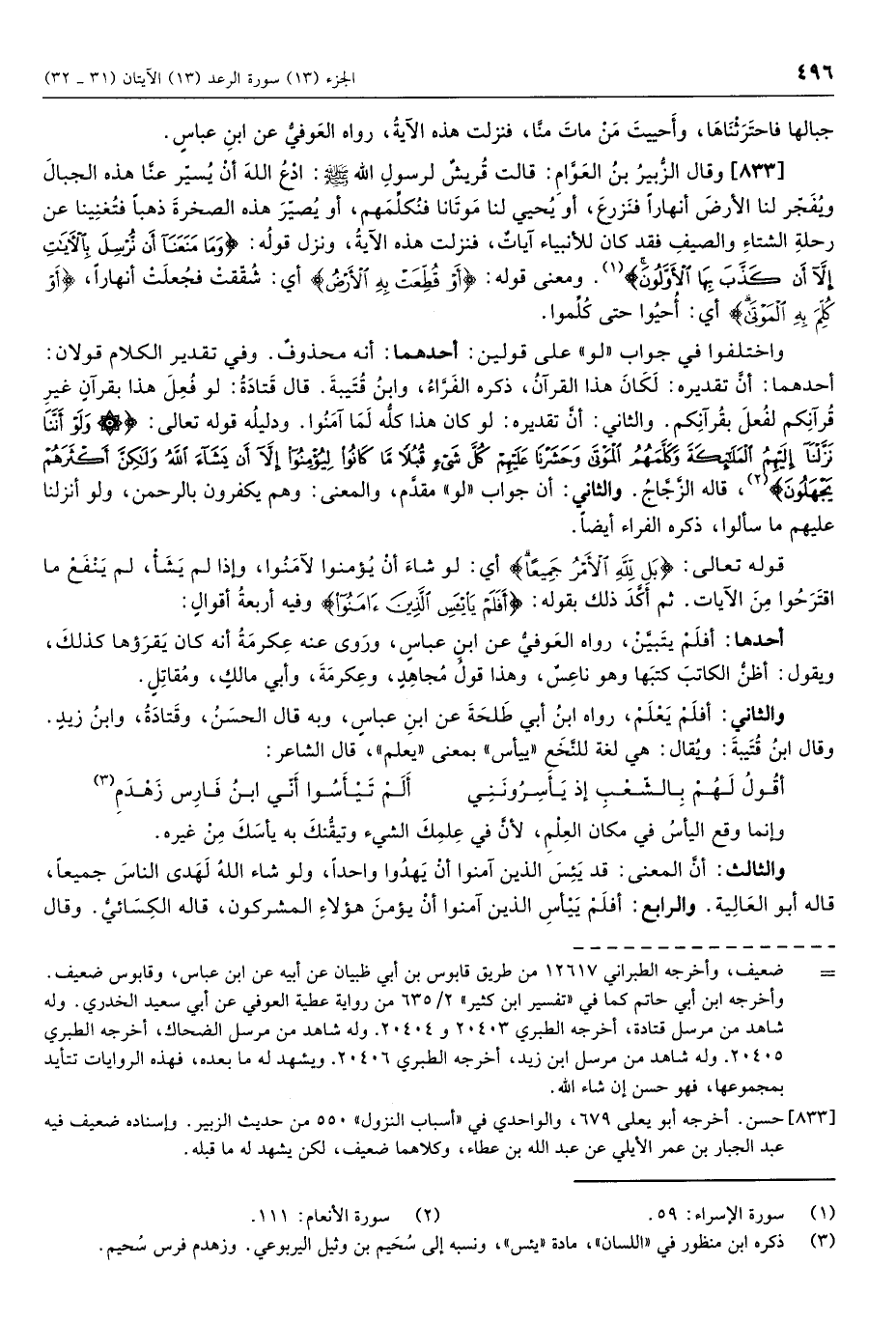 (833) وقال الزبير بن العوّام: قالت قريش لرسول الله صلّى الله عليه وسلم: ادع الله أن يسيِّر عنا هذه الجبال ويفجِّر لنا الأرض أنهاراً فنزرع، أو يحيي لنا موتانا فنكلمهم، أو يصيّر هذه الصخرة ذهباً فتغنينا عن رحلة الشتاء والصيف فقد كان للأنبياء آيات، فنزلت هذه الآية، ونزل قوله: وَما مَنَعَنا أَنْ نُرْسِلَ بِالْآياتِ إِلَّا أَنْ كَذَّبَ بِهَا الْأَوَّلُونَ «1» . ومعنى قوله: أَوْ قُطِّعَتْ بِهِ الْأَرْضُ أي: شقِّقت فجُعلت أنهاراً، أَوْ كُلِّمَ بِهِ الْمَوْتى أي: أُحيوا حتى كلّموا.