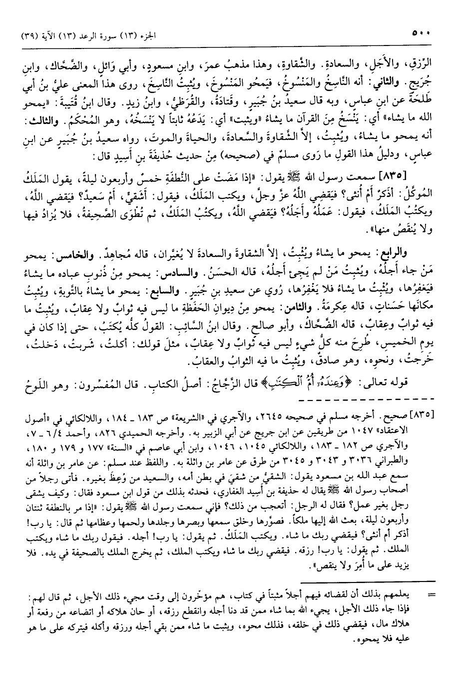 (835) سمعت رسول الله صلّى الله عليه وسلم يقول: «إِذا مضت على النطفة خمس وأربعون ليلة، يقول الملَك الموكَّل: أذَكر أم أنثى؟ فيقضي الله عزّ وجلّ، ويكتب الملَك، فيقول: أشقي، أم سعيد؟ فيقضي الله، ويكتب الملَك، فيقول: عمله وأجله؟ فيقضي الله، ويكتب الملَك، ثم تطوى الصحيفة، فلا يزاد فيها ولا يُنقص منها» .