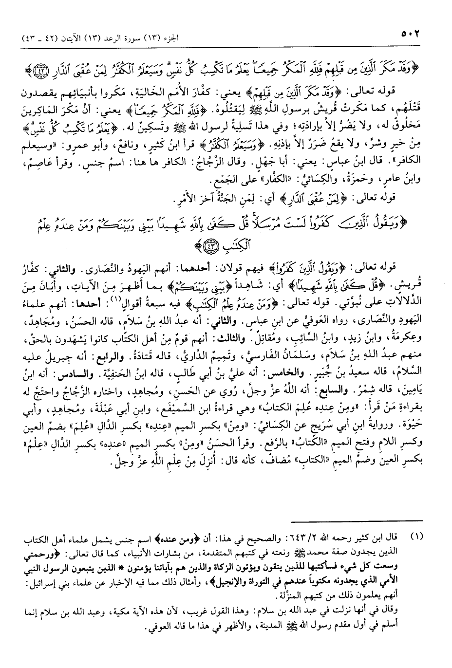 (1) قال ابن كثير رحمه الله 2/ 643: والصحيح في هذا: أن وَمَنْ عِنْدَهُ اسم جنس يشمل علماء أهل الكتاب الذين يجدون صفة محمد صلى الله عليه وسلم ونعته في كتبهم المتقدمة، من بشارات الأنبياء، كما قال تعالى: وَرَحْمَتِي وَسِعَتْ كُلَّ شَيْءٍ فَسَأَكْتُبُها لِلَّذِينَ يَتَّقُونَ وَيُؤْتُونَ الزَّكاةَ وَالَّذِينَ هُمْ بِآياتِنا يُؤْمِنُونَ الَّذِينَ يَتَّبِعُونَ الرَّسُولَ النَّبِيَّ الْأُمِّيَّ الَّذِي يَجِدُونَهُ مَكْتُوباً عِنْدَهُمْ فِي التَّوْراةِ وَالْإِنْجِيلِ، وأمثال ذلك مما فيه الإخبار عن علماء بني إسرائيل: