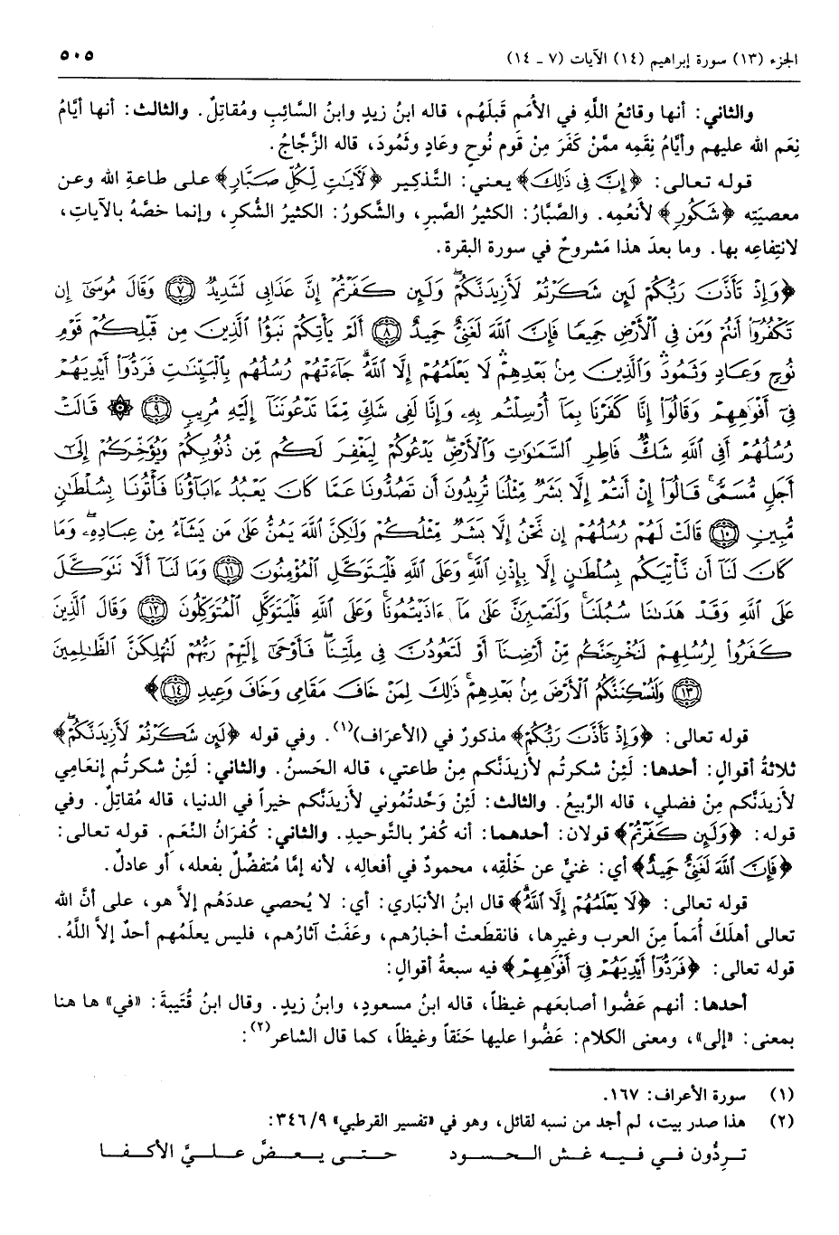 وَإِذْ تَأَذَّنَ رَبُّكُمْ لَئِنْ شَكَرْتُمْ لَأَزِيدَنَّكُمْ وَلَئِنْ كَفَرْتُمْ إِنَّ عَذابِي لَشَدِيدٌ (7) وَقالَ مُوسى إِنْ تَكْفُرُوا أَنْتُمْ وَمَنْ فِي الْأَرْضِ جَمِيعاً فَإِنَّ اللَّهَ لَغَنِيٌّ حَمِيدٌ (8) أَلَمْ يَأْتِكُمْ نَبَؤُا الَّذِينَ مِنْ قَبْلِكُمْ قَوْمِ نُوحٍ وَعادٍ وَثَمُودَ وَالَّذِينَ مِنْ بَعْدِهِمْ لا يَعْلَمُهُمْ إِلاَّ اللَّهُ جاءَتْهُمْ رُسُلُهُمْ بِالْبَيِّناتِ فَرَدُّوا أَيْدِيَهُمْ فِي أَفْواهِهِمْ وَقالُوا إِنَّا كَفَرْنا بِما أُرْسِلْتُمْ بِهِ وَإِنَّا لَفِي شَكٍّ مِمَّا تَدْعُونَنا إِلَيْهِ مُرِيبٍ (9) قالَتْ رُسُلُهُمْ أَفِي اللَّهِ شَكٌّ فاطِرِ السَّماواتِ وَالْأَرْضِ يَدْعُوكُمْ لِيَغْفِرَ لَكُمْ مِنْ ذُنُوبِكُمْ وَيُؤَخِّرَكُمْ إِلى أَجَلٍ مُسَمًّى قالُوا إِنْ أَنْتُمْ إِلاَّ بَشَرٌ مِثْلُنا تُرِيدُونَ أَنْ تَصُدُّونا عَمَّا كانَ يَعْبُدُ آباؤُنا فَأْتُونا بِسُلْطانٍ مُبِينٍ (10) قالَتْ لَهُمْ رُسُلُهُمْ إِنْ نَحْنُ إِلاَّ بَشَرٌ مِثْلُكُمْ وَلكِنَّ اللَّهَ يَمُنُّ عَلى مَنْ يَشاءُ مِنْ عِبادِهِ وَما كانَ لَنا أَنْ نَأْتِيَكُمْ بِسُلْطانٍ إِلاَّ بِإِذْنِ اللَّهِ وَعَلَى اللَّهِ فَلْيَتَوَكَّلِ الْمُؤْمِنُونَ (11)