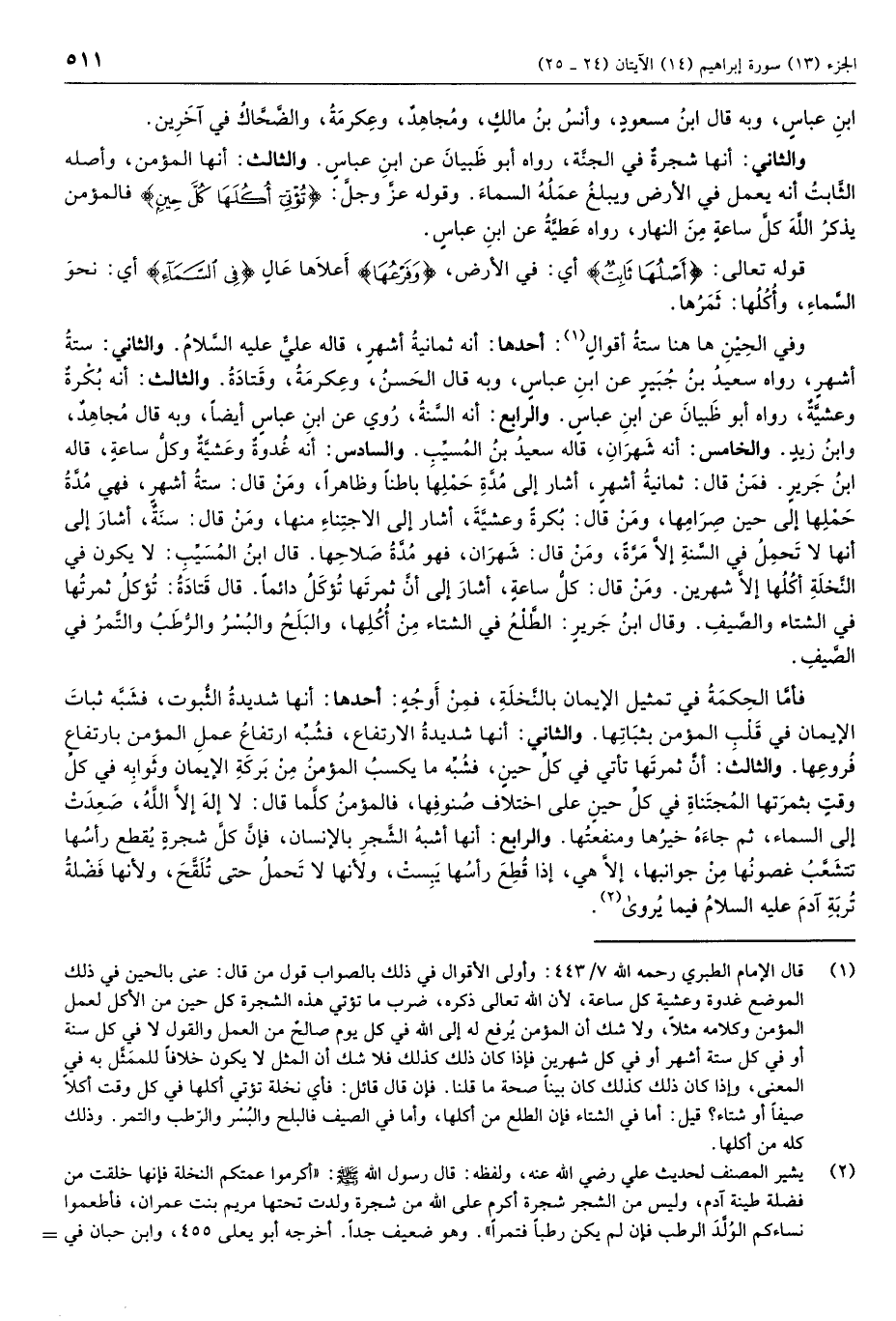 (1) قال الإمام الطبري رحمه الله 7/ 443: وأولى الأقوال في ذلك بالصواب قول من قال: عنى بالحين في ذلك الموضع غدوة وعشية كل ساعة، لأن الله تعالى ذكره، ضرب ما تؤتي هذه الشجرة كل حين من الأكل لعمل المؤمن وكلامه مثلا، ولا شك أن المؤمن يرفع له إلى الله في كل يوم صالح من العمل والقول لا في كل سنة أو في كل ستة أشهر أو في كل شهرين فإذا كان ذلك كذلك فلا شك أن المثل لا يكون خلافا للممثّل به في المعنى، وإذا كان ذلك كذلك كان بينا صحة ما قلنا. فإن قال قائل: فأي نخلة تؤتي أكلها في كل وقت أكلا صيفا أو شتاء؟ قيل: أما في الشتاء فإن الطلع من أكلها، وأما في الصيف فالبلح والبسر والرّطب والتمر. وذلك كله من أكلها.
