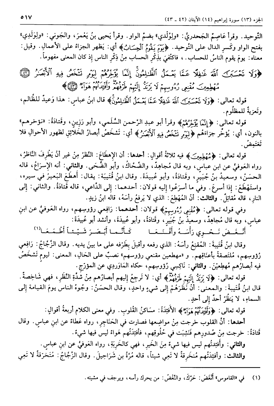 وقال ابن قتيبة: المقنع رأسه: الذي رفعه وأقبل بطرْفه على ما بين يديه. وقال الزّجّاج: رافعي رؤوسهم، ملتصقة بأعناقهم. و «مهطعين مقنعي رؤوسهم» نصبٌ على الحال، المعنى: ليوم تشخص فيه أبصارهم مهطعين. والثاني: ناكسي رؤوسِهم، حكاه الماوردي عن المؤرِّج.