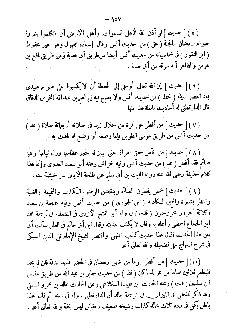 (9) [حَدِيثٌ] خَمْسٌ يُفْطِرُن الصَّائِمَ وَيَنْقُضْنَ الْوُضُوءَ الْكَذِبُ وَالنَّمِيمَةُ وَالْغِيبَةُ وَالنَّظَرُ بِشَهْوَةٍ وَالْيَمِينُ الْكَاذِبَةُ (ابْن الْجَوْزِيّ) من حَدِيث أنس وَفِيه عَنْبَسَة بن سعيد وَثَلَاثَة آخَرُونَ مجروحون (قلت) وَرَوَاهُ أَبُو الْفَتْح الْأَزْدِيّ فِي الضُّعَفَاء فِي تَرْجَمَة مُحَمَّد ابْن الْحجَّاج الْحِمصِي وَأعله بِهِ وَقَالَ لَا يكْتب حَدِيثه وَقَالَ ابْن أبي حَاتِم فِي الْعِلَل سَأَلت أبي عَن هَذَا الحَدِيث فَقَالَ هَذَا حَدِيث كذب انْتهى وَاقْتصر الشَّيْخ الإِمَام تَقِيّ الدَّين السُّبْكِيّ فِي شرح الْمِنْهَاج على تَضْعِيفه وَالله تَعَالَى أعلم.