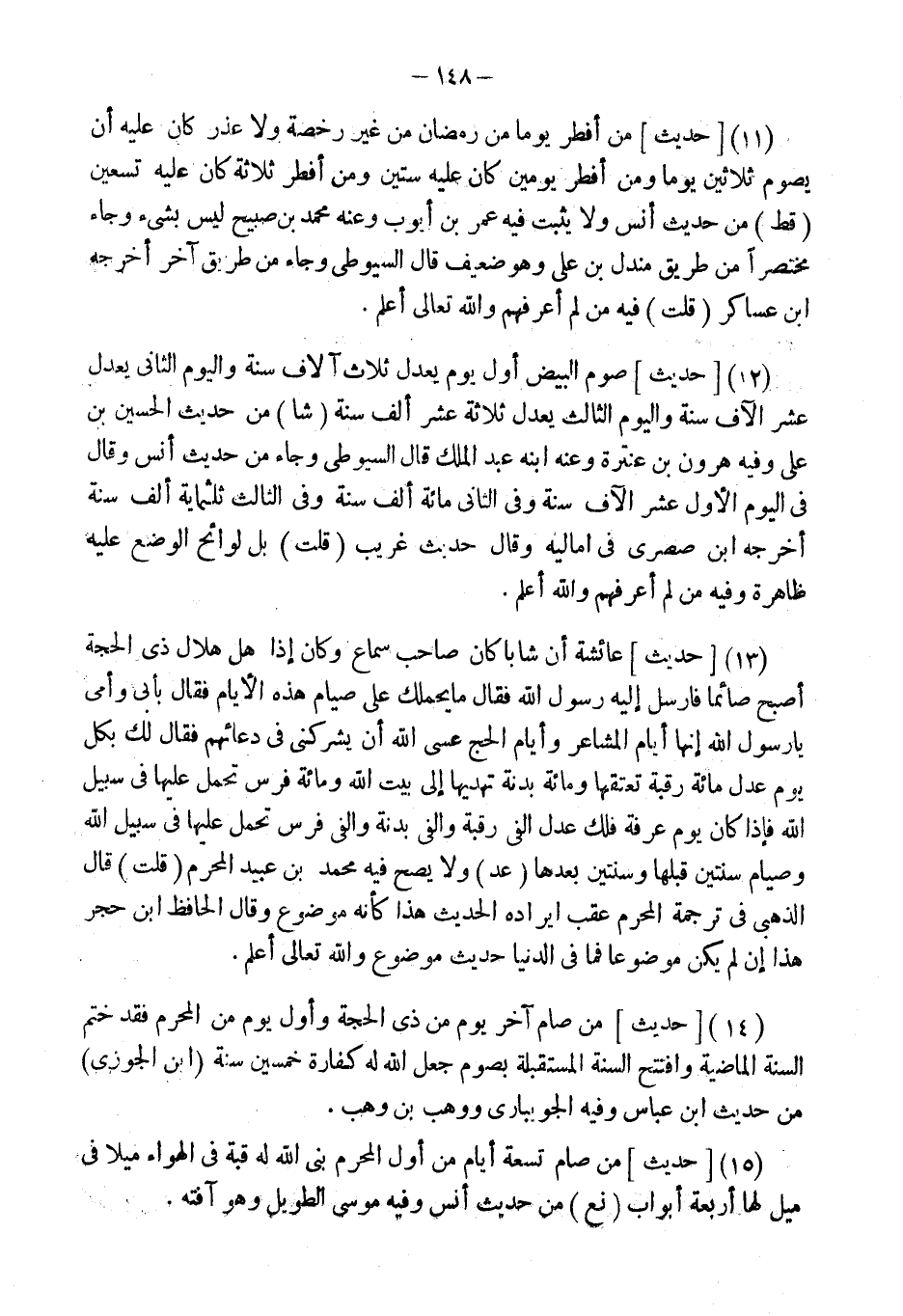 (13) [حَدِيثُ] عَائِشَةَ أَنَّ شَابًّا كَانَ صَاحِبَ سَمَاعٍ وَكَانَ إِذَا هَلَّ هِلالُ ذِي الْحِجَّةِ أَصْبَحَ صَائِمًا فَأَرْسَلَ إِلَيْهِ رَسُولُ الله فَقَالَ مَا يَحْمِلُكَ عَلَى صِيَامِ هَذِهِ الأَيَّامِ فَقَالَ بِأَبِي وَأُمِّي يَا رَسُولَ اللَّهِ إِنَّهَا أَيَّامُ الْمَشَاعِرِ وَأَيَّامُ الْحَجِّ عَسَى اللَّهُ أَنْ يَشْرِكَنِي فِي دُعَائِهِمْ فَقَالَ لَكَ بِكُلِّ يَوْمٍ عَدْلُ مِائَةِ رَقَبَةٍ تُعْتِقُهَا وَمِائَةِ بَدَنَةٍ تُهْدِيهَا إِلَى بَيْتِ اللَّهِ وَمِائَةِ فَرَسٍ تُحْمَلُ عَلَيْهَا فِي سَبِيلِ اللَّهِ فَإِذَا كَانَ يَوْمُ عَرَفَةَ فَلَكَ عَدْلُ أَلْفَيْ رَقَبَةٍ وَأَلْفَيْ بَدَنَةٍ وَأَلْفَيْ فَرَسٍ تُحْمَلُ عَلَيْهَا فِي سَبِيلِ اللَّهِ وَصِيَامُ سَنَتَيْنِ قَبْلَهَا وَسَنَتَيْنِ بَعْدَهَا (عد) وَلَا يَصح فِيهِ مُحَمَّد بن عبيد الْمحرم (قلت) قَالَ الذَّهَبِيُّ فِي تَرْجَمَةِ الْمحرم عقب إِيرَاده الحَدِيث هَذَا كَأَنَّهُ مَوْضُوع وَقَالَ الْحَافِظ ابْن حجر هَذَا إِن لم يكن مَوْضُوعا فَمَا فِي الدُّنْيَا حَدِيث مَوْضُوع وَالله تَعَالَى أعلم.