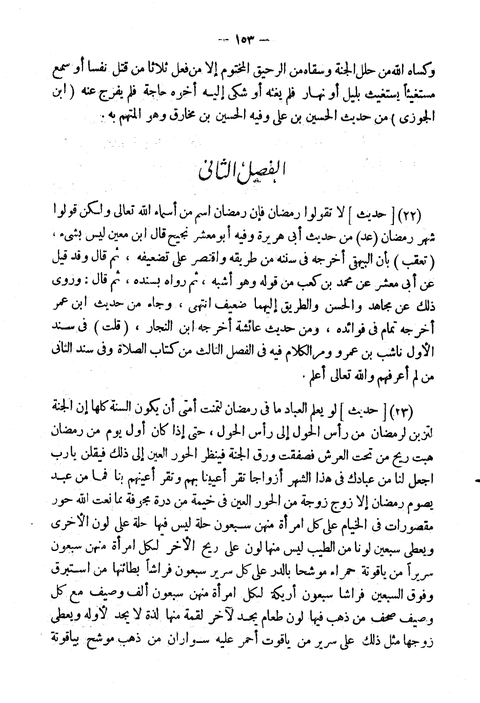 (23) [حَدِيثٌ] لَوْ يَعْلَمُ الْعِبَادُ مَا فِي رَمَضَانَ لَتَمَنَّتْ أُمَّتِي أَنْ يَكُونَ السَّنَةَ كُلَّهَا إِنَّ الْجَنَّةَ لَتُزَيَّنُ لِرَمَضَانَ مِنْ رَأْسِ الْحَوْلِ إِلَى رَأْسِ الْحَوْلِ، حَتَّى إِذَا كَانَ أَوَّلُ يَوْمٍ مِنْ رَمَضَانَ هَبَّتْ رِيحٌ مِنْ تَحْتِ الْعَرْشِ فَصَفَقَتْ وَرَقَ الْجَنَّةِ فَيَنْظُرُ الْحُورُ الْعِينُ إِلَى ذَلِكَ فَيَقُلْنَ يَا رَبِّ اجْعَلْ لَنَا مِنْ عِبَادِكَ فِي هَذَا الشَّهْرِ أَزْوَاجًا تَقَرُّ أعيينا بهم وتقر أَعْيُنُهُمْ بِنَا فَمَا مِنْ عَبْدٍ يَصُومُ رَمَضَانَ إِلا زُوِّجَ زَوْجَةً مِنَ الْحُورِ الْعِينِ فِي خَيْمَةٍ مِنْ دُرَّةٍ مُجَوَّفَةٍ مِمَّا نَعَتَ اللَّهُ {حُورٌ مَقْصُورَاتٌ فِي الْخِيَامِ} عَلَى كُلِّ امْرَأَةٍ مِنْهُنَّ سَبْعُونَ حُلَّةً لَيْسَ فِيهَا حُلَّةٌ عَلَى لَوْنِ الأُخْرَى وَيُعْطَى سَبْعِينَ لَوْنًا مِنَ الطِّيبِ لَيْسَ مِنْهَا لَوْنٌ عَلَى رِيحِ الآخَرِ لِكُلِّ امْرَأَةٍ مِنْهُنَّ سَبْعُونَ سَرِيرًا مِنْ يَاقُوتَةٍ حَمْرَاءَ مُوَشَّحًا بِالدُّرِّ عَلَى كُلِّ سَرِيرٍ سَبْعُونَ فِرَاشًا بَطَائِنُهَا مِنْ إِسْتَبْرَقٍ وَفَوْقَ السَّبْعِينَ فِرَاشًا سَبْعُونَ أَرِيكَةً لِكُلِّ امْرَأَةٍ مِنْهُنَّ سَبْعُونَ أَلْفَ وَصِيفٍ مَعَ كُلِّ وَصِيفٍ صُحُفٌ مِنْ ذَهَبٍ فِيهَا لَوْنُ طَعَامٍ يَجِدُ لآخِرِ لُقْمَةٍ مِنْهَا لَذَّةً لَا يَجِدُ لأَوَّلِه وَيُعْطَى زَوْجُهَا مِثْلَ ذَلِكَ عَلَى سَرِيرٍ مِنْ يَاقُوتٍ أَحْمَرَ عَلَيْهِ سِوَارَانِ من ذهب موشح بياقوتة