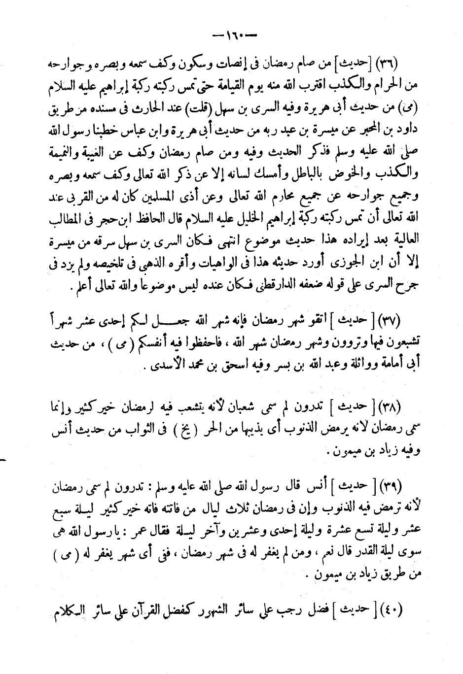 (36) [حَدِيثٌ] مَنْ صَامَ رَمَضَانَ فِي إِنْصَاتٍ وَسُكُونٍ وَكَفَّ سَمْعَهُ وَبَصَرَهُ وَجَوَارِحَهُ مِنَ الْحَرَامِ وَالْكَذِبِ اقْتَرَبَ اللَّهُ مِنْهُ يَوْمَ الْقِيَامَةِ حَتَّى تَمَسَّ رُكْبَتُهُ رُكْبَةَ إِبْرَاهِيمَ عَلَيْهِ السَّلامُ (مي) من حَدِيث أبي هُرَيْرَة وَفِيه السّري بن سهل (قلت) عِنْد الْحَارِث فِي مُسْنده مِنْ طَرِيقِ دَاوُدَ بْنِ الْمُحَبِّرِ عَن ميسرَة بن عبد ربه من حَدِيث أبي هُرَيْرَة وَابْن عَبَّاس خَطَبنَا رَسُول الله فَذكر الحَدِيث وَفِيه وَمن صَامَ رَمَضَان وكف عَن الْغَيْبَة والنميمة وَالْكذب والخوض بِالْبَاطِلِ وَأمْسك لِسَانه إِلَّا عَن ذكر الله تَعَالَى وكف سَمعه وبصره وَجَمِيع جوارحه عَن جَمِيع محارم الله تَعَالَى وَعَن أَذَى الْمُسلمين كَانَ لَهُ من الْقُرْبَى عِنْد الله تَعَالَى أَن تمس ركبته ركبة إِبْرَاهِيم الْخَلِيل عَلَيْهِ السَّلَام قَالَ الْحَافِظ ابْن حجر فِي المطالب الْعَالِيَة بعد إِيرَاده هَذَا حَدِيث مَوْضُوع انْتهى فَكَانَ السّري بن سهل سَرقه من ميسرَة إِلَّا أَن ابْن الْجَوْزِيّ أورد حَدِيثه هَذَا فِي الواهيات وَأقرهُ الذَّهَبِيّ فِي تلخيصه وَلم يزدْ فِي جرح السّري على قَوْله ضعفه الدَّارَقُطْنِيّ فَكَانَ عِنْده لَيْسَ مَوْضُوعا وَالله تَعَالَى أعلم.