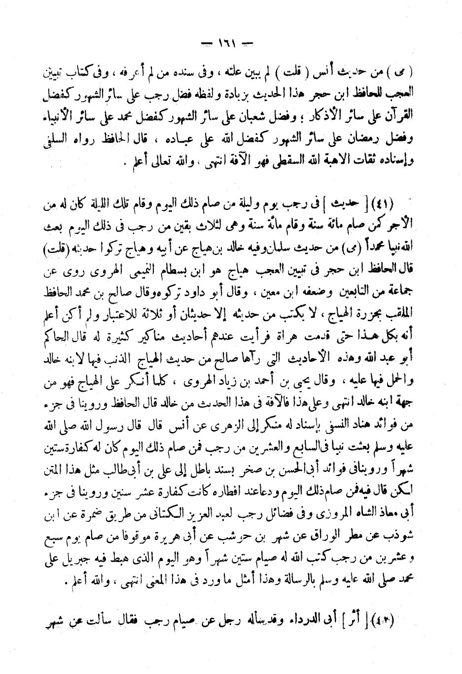 (41) [حَدِيثُ] فِي رَجَبٍ يَوْمٌ وَلَيْلَةٌ مَنْ صَامَ ذَلِكَ الْيَوْمَ وَقَامَ تِلْكَ اللَّيْلَةَ كَانَ لَهُ مِنَ الأَجْرِ كَمَنْ صَامَ مِائَةَ سَنَةٍ وَقَامَ مِائَةَ سَنَةٍ وَهِيَ لِثَلاثٍ بَقِينَ مِنْ رَجَبٍ فِي ذَلِكَ الْيَوْمِ بَعَثَ اللَّهُ نَبِيًّا مُحَمَّدًا (مي) من حَدِيث سلمَان وَفِيه خَالِد بن هياج عَن أَبِيه وَهياج تركُوا حَدِيثه (قلت) قَالَ الْحَافِظ ابْن حجر فِي تَبْيِين الْعجب هياج هُوَ ابْن بسطَام النميمي الْهَرَوِيّ روى عَن جمَاعَة من التَّابِعين وَضَعفه ابْن معِين، وَقَالَ أَبُو دَاوُد تَرَكُوهُ وَقَالَ صَالح بن مُحَمَّد الْحَافِظ الملقب بجزرة الْهياج، لَا يكْتب من حَدِيثه إِلَّا حديثان أَو ثَلَاثَة للاعتبار وَلم أكن أعلم أَنه بِكُل هَذَا حَتَّى قدمت هراة فَرَأَيْت عِنْدهم أَحَادِيث مَنَاكِير كَثِيرَة لَهُ قَالَ الْحَاكِم أَبُو عبد الله وَهَذِه الْأَحَادِيث الَّتِي رَآهَا صَالح من حَدِيث الْهياج الذَّنب فِيهَا لِابْنِهِ خَالِد وَالْحمل فِيهَا عَلَيْهِ، وَقَالَ يحيى بن أَحْمد بن زِيَاد الْهَرَوِيّ، كلما أنكر على الْهياج فَهُوَ من جِهَة ابْنه خَالِد انْتهى وعَلى هَذَا فالآفة فِي هَذَا الحَدِيث من خَالِد قَالَ الْحَافِظ وروينا فِي جُزْء من فَوَائِد هناد النَّسَفِيّ بِإِسْنَاد لَهُ مُنكر إِلَى الزُّهْرِيّ عَن أنس قَالَ قَالَ رَسُول الله بعثت نَبيا فِي السَّابِع وَالْعِشْرين من رَجَب فَمن صَامَ ذَلِك الْيَوْم كَانَ لَهُ كَفَّارَة سِتِّينَ شهرا وروينا فِي فَوَائِد أبي الْحسن بن صَخْر بِسَنَد بَاطِل إِلَى عَلِيِّ بْنِ أَبِي طَالِبٍ مثل هَذَا الْمَتْن لَكِن قَالَ فِيهِ فَمن صَامَ ذَلِك الْيَوْم ودعا عِنْد إفطاره كَانَت كَفَّارَة عشر سِنِين وروينا فِي جُزْء أبي معَاذ الشاه الْمروزِي وَفِي فَضَائِل رَجَب لعبد الْعَزِيز الكتاني من طَرِيق ضَمرَة عَن ابْن شَوْذَب عَن مطر الْوراق عَن شهر بن حَوْشَب عَن أبي هُرَيْرَة مَوْقُوفا من صَامَ يَوْم سبع وَعشْرين من رَجَب كتب الله لَهُ صِيَام سِتِّينَ شهرا وَهُوَ الْيَوْم الَّذِي هَبَط فِيهِ جِبْرِيل على مُحَمَّد بالرسالة وَهَذَا أمثل مَا ورد فِي هَذَا الْمَعْنى انْتهى، وَالله أعلم.
