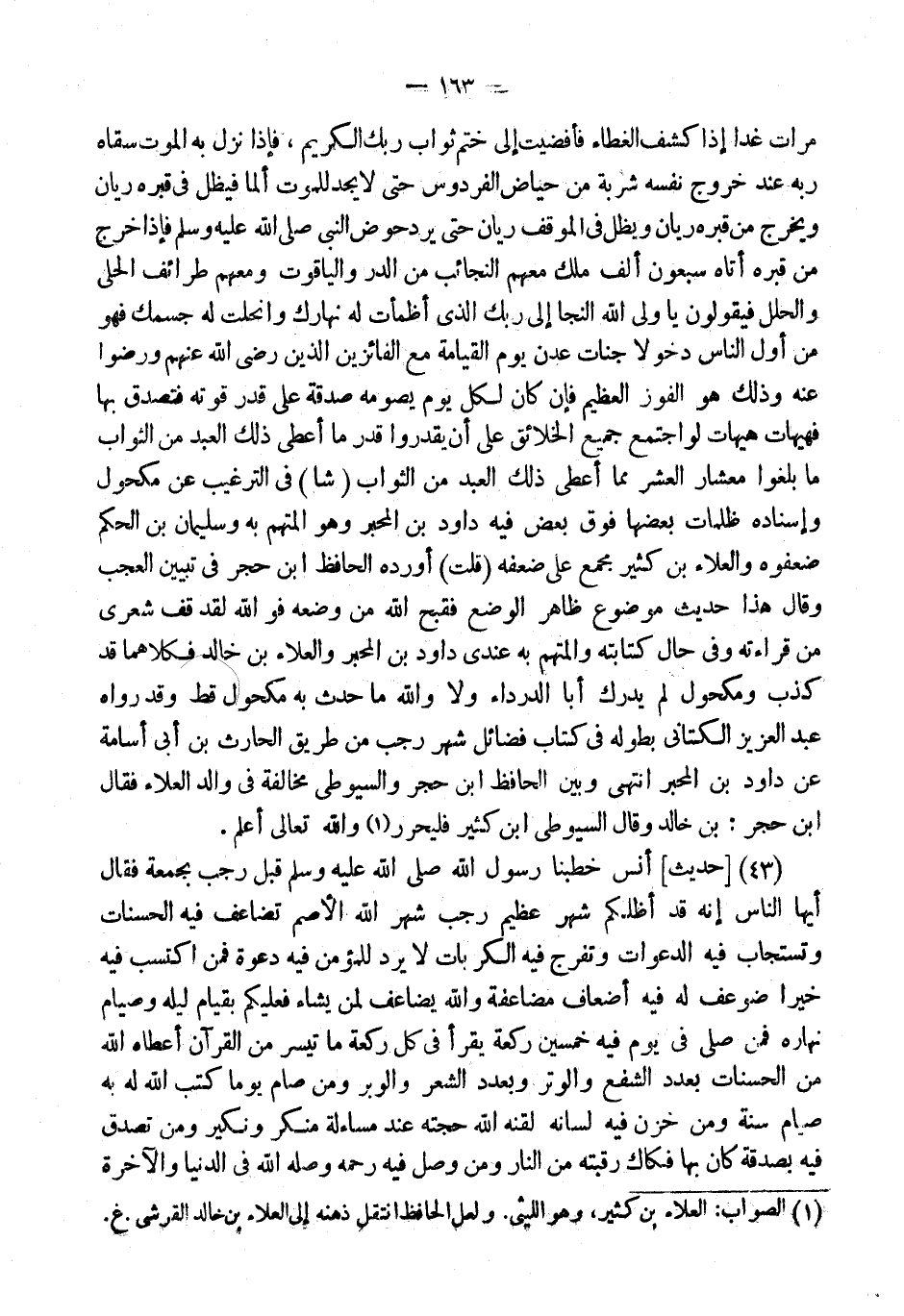 (43) [حَدِيثُ] أنس خَطَبنَا رَسُول الله قَبْلَ رَجَبٍ بِجُمُعَةٍ فَقَالَ أَيُّهَا النَّاسُ إِنَّهُ قَدْ أَظَلَّكُمْ شَهْرٌ عَظِيمٌ رَجَبٌ شَهْرُ اللَّهِ الأَصَمُّ تُضَاعَفُ فِيهِ الْحَسَنَاتُ وَتُسْتَجَابُ فِيهِ الدَّعَوَاتُ وَتُفَرَّجُ فِيهِ الْكُرُبَاتُ لَا يُرَدُّ لِلْمُؤْمِنِ فِيهِ دَعْوَةٌ فَمَنِ اكْتَسَبَ فِيهِ خَيْرًا ضُوعِفَ لَهُ فِيهِ أَضْعَافٌ مُضَاعَفَةٌ وَاللَّهُ يُضَاعِفُ لِمَنْ يَشَاءُ فَعَلَيْكُمْ بِقِيَامِ لَيْلِهِ وَصِيَامِ نَهَارِهِ فَمَنْ صَلَّى فِي يَوْمٍ فِيهِ خَمْسِينَ رَكْعَةً يَقْرَأُ فِي كُلِّ رَكْعَةٍ مَا تَيَسَّرَ مِنَ الْقُرْآنِ أَعْطَاهُ اللَّهُ مِنَ الْحَسَنَاتِ بِعَدَدِ الشَّفْعِ وَالْوِتْرِ وَبِعَدَدِ الشَّعْرِ وَالْوَبَرِ وَمَنْ صَامَ يَوْمًا كَتَبَ اللَّهُ لَهُ بِهِ صِيَامَ سَنَةٍ وَمَنْ خَزَنَ فِيهِ لِسَانَهُ لَقَّنَهُ اللَّهُ حُجَّتَهُ عِنْدَ مُسَاءَلَةِ مُنْكَرٍ وَنَكِيرٍ وَمَنْ تَصَدَّقَ فِيهِ بِصَدَقَةٍ كَانَ بِهَا فِكَاكُ رَقَبَتِهِ مِنَ النَّارِ وَمَنْ وَصَلَ فِيهِ رَحِمَهُ وَصَلَهُ اللَّهُ فِي الدُّنْيَا وَالْآخِرَة