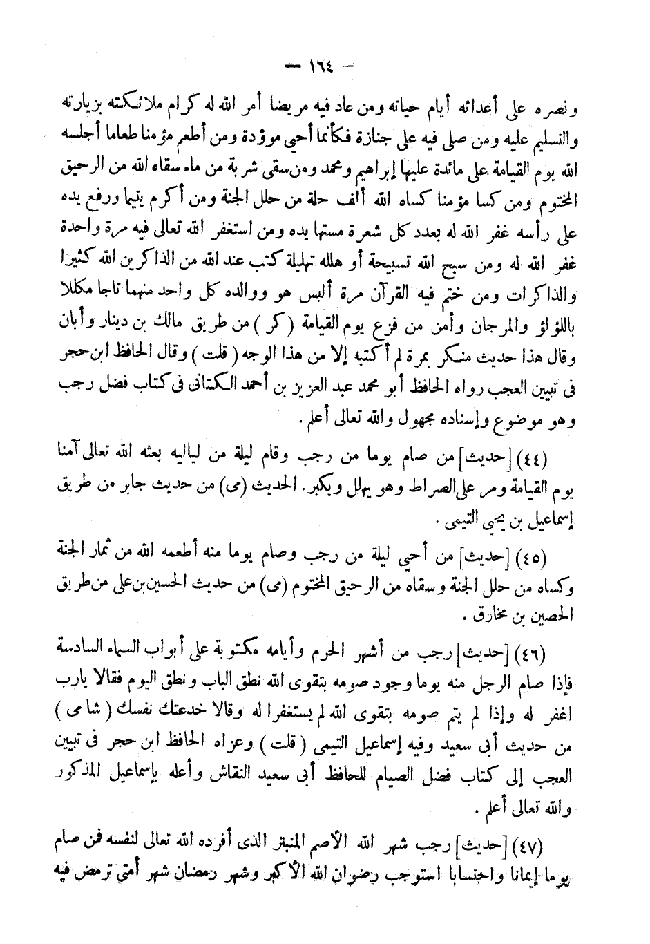 (44) [حَدِيثُ] مَنْ صَامَ يَوْمًا مِنْ رَجَبٍ وَقَامَ لَيْلَةً مِنْ لَيَالِيهِ بَعَثَهُ اللَّهُ تَعَالَى آمِنًا يَوْمَ الْقِيَامَةِ وَمَرَّ عَلَى الصِّرَاطِ وَهُوَ يُهَلِّلُ وَيُكَبِّرُ.