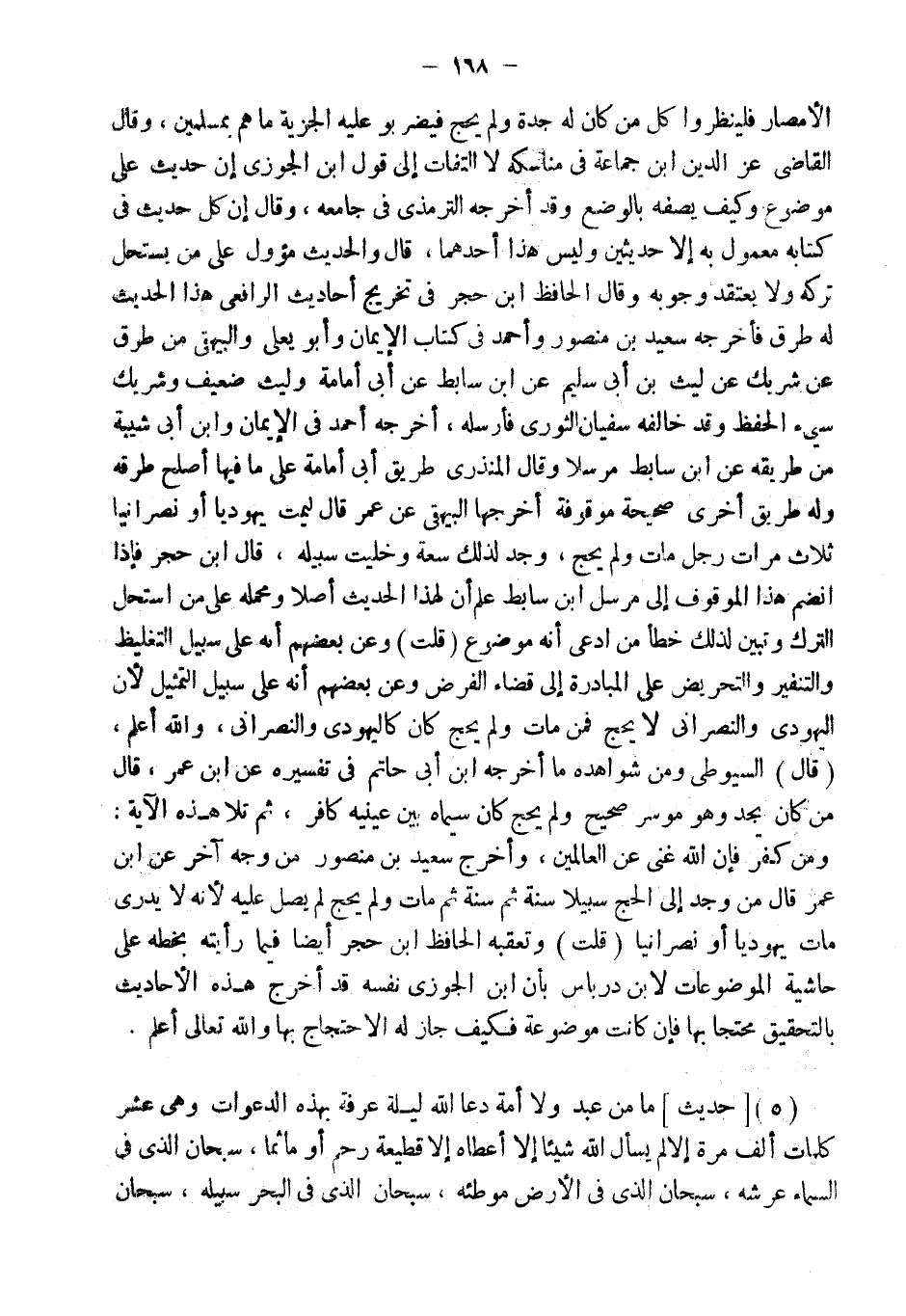 الْأَمْصَار فلينظروا كل من كَانَ لَهُ جدة وَلم يحجّ فيضربو عَلَيْهِ الْجِزْيَة مَا هم بمسلمين، وَقَالَ القَاضِي عز الدَّين ابْن جمَاعَة فِي مَنَاسِكه لَا الْتِفَات إِلَى قَول ابْن الْجَوْزِيّ إِن حَدِيث عَليّ مَوْضُوع وَكَيف يصفه بِالْوَضْعِ وَقد أخرجه التِّرْمِذِيّ فِي جَامعه، وَقَالَ إِن كل حَدِيث فِي كِتَابه مَعْمُول بِهِ إِلَّا حديثين وَلَيْسَ هَذَا أَحدهمَا، قَالَ والْحَدِيث مؤول على من يسْتَحل تَركه وَلَا يعْتَقد وُجُوبه وَقَالَ الْحَافِظ ابْن حجر فِي تَخْرِيج أَحَادِيث الرَّافِعِيّ هَذَا الحَدِيث لَهُ طرق فَأخْرجهُ سعيد بن مَنْصُور وَأحمد فِي كتاب الْإِيمَان وَأَبُو يعلى وَالْبَيْهَقِيّ من طرق عَن شريك عَن لَيْث بن أبي سليم عَن ابْن سابط عَن أبي أُمَامَة وَلَيْث ضَعِيف وَشريك سيء الْحِفْظ وَقد خَالفه سُفْيَان الثَّوْريّ فَأرْسلهُ، أخرجه أَحْمد فِي الْإِيمَان وَابْن أبي شيبَة من طَرِيقه عَن ابْن سابط مُرْسلا وَقَالَ الْمُنْذِرِيّ طَرِيق أبي أُمَامَة على مَا فِيهَا أصلح طرقه وَله طَرِيق أُخْرَى صَحِيحَة مَوْقُوفَة أخرجهَا الْبَيْهَقِيّ عَن عمر قَالَ ليمت يَهُودِيّا أَو نَصْرَانِيّا ثَلَاث مَرَّات رجل مَاتَ وَلم يحجّ، وجد لذَلِك سَعَة وخليت سَبيله، قَالَ ابْن حجر فَإِذا انْضَمَّ هَذَا الْمَوْقُوف إِلَى مُرْسل ابْن سابط علم أَن لهَذَا الحَدِيث أصلا ومحمله على من اسْتحلَّ التّرْك وَتبين لذَلِك خطأ من ادّعى أَنه مَوْضُوع (قلت) وَعَن بَعضهم أَنه على سَبِيل التَّغْلِيظ والتنفير والتحريض على الْمُبَادرَة إِلَى قَضَاء الْفَرْض وَعَن بَعضهم أَنه على سَبِيل التَّمْثِيل لِأَن الْيَهُودِيّ وَالنَّصْرَانِيّ لَا يحجّ فَمن مَاتَ وَلم يحجّ كَانَ كاليهودي وَالنَّصْرَانِيّ، وَالله أعلم، (قَالَ) السُّيُوطِيّ وَمن شواهده مَا أخرجه ابْن أبي حَاتِم فِي تَفْسِيره عَن ابْن عمر، قَالَ من كَانَ يجد وَهُوَ مُوسر صَحِيح وَلم يحجّ كَانَ سيماه بَين عَيْنَيْهِ كَافِر، ثمَّ تَلا هَذِه الْآيَة: {وَمَنْ كَفَرَ فَإِنَّ اللَّهَ غَنِيٌّ عَنِ الْعَالَمِينَ} ، وَأخرج سعيد بن مَنْصُور من وَجه آخر عَن ابْن عمر قَالَ من وجد إِلَى الْحَج سَبِيلا سنة ثمَّ سنة ثمَّ مَاتَ وَلم يحجّ لم يصل عَلَيْهِ لِأَنَّهُ لَا يدرى مَاتَ يَهُودِيّا أَو نَصْرَانِيّا (قلت) وَتعقبه الْحَافِظ ابْن حجر أَيْضا فِيمَا رَأَيْته بِخَطِّهِ على حَاشِيَة الموضوعات لِابْنِ درباس بِأَن ابْن الْجَوْزِيّ نَفسه قد أخرج هَذِه الْأَحَادِيث بالتحقيق محتجا بهَا فَإِن كَانَت مَوْضُوعَة فَكيف جَازَ لَهُ الِاحْتِجَاج بهَا وَالله تَعَالَى أعلم.