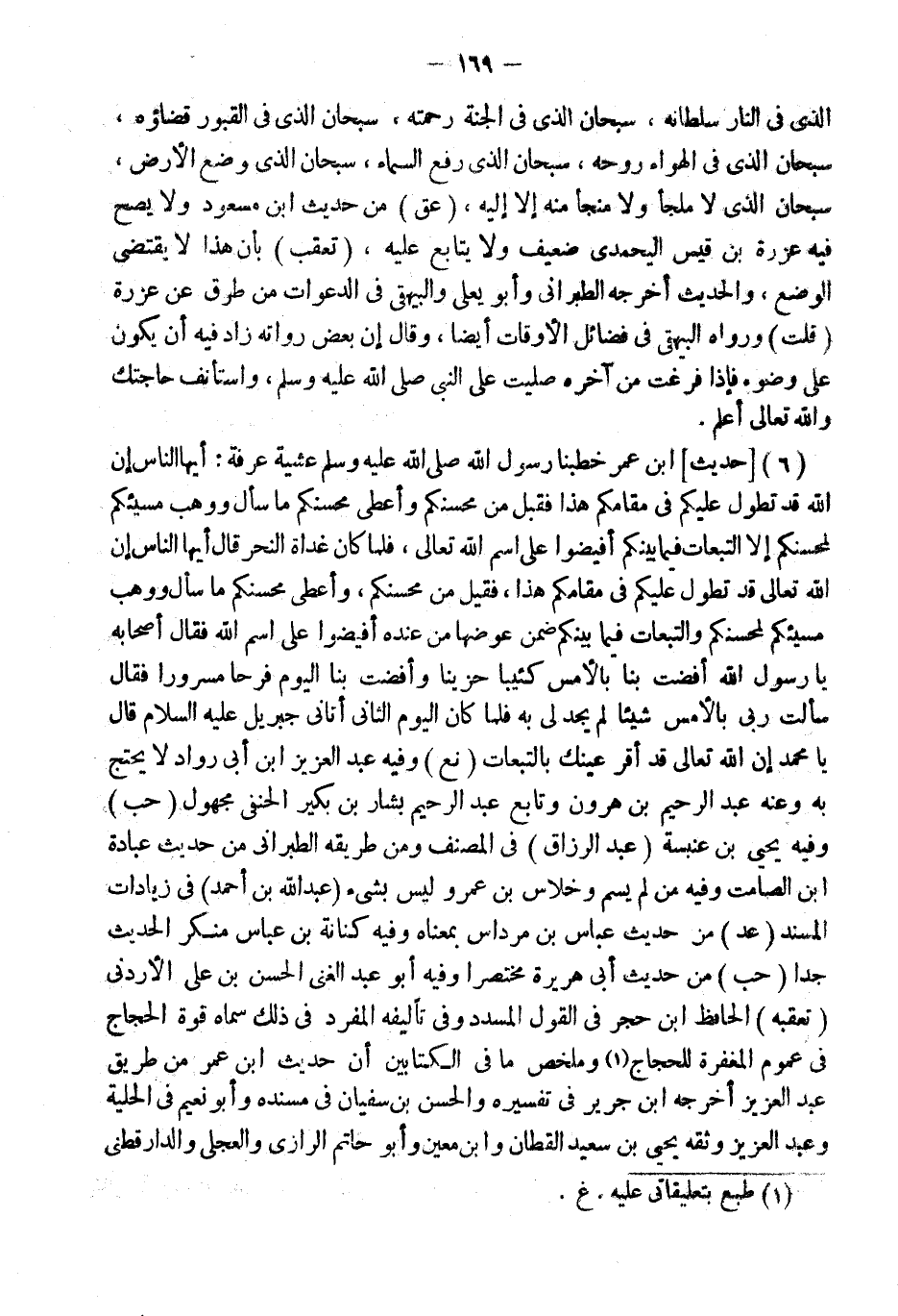 (6) [حَدِيثُ] ابْنِ عُمَرَ خَطَبَنَا رَسُولُ الله عَشِيَّةَ عَرَفَةَ: أَيُّهَا النَّاسُ إِنَّ اللَّهَ قَدْ تَطَوَّلَ عَلَيْكُمْ فِي مَقَامِكُمْ هَذَا فَقَبِلَ مِنْ مُحْسِنِكُمْ وَأَعْطَى مُحْسِنَكُمْ مَا سَأَلَ وَوَهَبَ مُسِيئَكُمْ لِمُحْسِنِكُمْ إِلا التَّبِعَاتِ فِيمَا بَيْنَكُمْ أَفِيضُوا عَلَى اسْمِ اللَّهِ تَعَالَى، فَلَمَّا كَانَ غَدَاةُ النَّحْرِ قَالَ أَيُّهَا النَّاسُ إِنَّ اللَّهَ تَعَالَى قَدْ تَطَوَّلَ عَلَيْكُمْ فِي مقامكم هَذَا، فَقيل مِنْ مُحْسِنِكُمْ، وَأَعْطَى مُحْسِنَكُمْ مَا سَأَلَ وَوَهَبَ مُسِيئَكُمْ لِمُحْسِنِكُمْ وَالتَّبِعَاتُ فِيمَا بَيْنَكُمْ ضَمِنَ عِوَضَهَا مِنْ عِنْدِهِ أَفِيضُوا عَلَى اسْمِ اللَّهِ فَقَالَ أَصْحَابُهُ يَا رَسُولَ اللَّهِ أَفَضْتَ بِنَا بِالأَمْسِ كَئِيبًا حَزِينًا وَأَفَضْتَ بِنَا الْيَوْمَ فَرِحًا مَسْرُورًا فَقَالَ سَأَلْتُ رَبِّي بِالأَمْسِ شَيْئًا لَمْ يَجُدْ لِي بِهِ فَلَمَّا كَانَ الْيَوْمُ الثَّانِي أَتَانِي جِبْرِيلُ عَلَيْهِ السَّلامُ قَالَ يَا مُحَمَّدُ إِنَّ اللَّهَ تَعَالَى قَدْ أَقَرَّ عَيْنَكَ بِالتَّبِعَاتِ (نع) وَفِيه عبد الْعَزِيز ابْن أبي رواد لَا يحْتَج بِهِ وَعنهُ عبد الرَّحِيم بن هَارُون وتابع عبد الرَّحِيم بشار بن بكير الْحَنَفِيّ مَجْهُول (حب) وَفِيه يحيى بن عَنْبَسَة (عبد الرَّزَّاق) فِي المُصَنّف وَمن طَرِيقه الطَّبَرَانِيّ من حَدِيث عبَادَة ابْن الصَّامِت وَفِيه من لم يسم وخلاس بن عَمْرو لَيْسَ بِشَيْء (عبد الله بن أَحْمد) فِي زيادات الْمسند (عد) من حَدِيث عَبَّاس بن مرداس بِمَعْنَاهُ وَفِيه كنَانَة بن عَبَّاس مُنكر الحَدِيث جدا (حب) من حَدِيث أبي هُرَيْرَة مُخْتَصرا وَفِيه أَبُو عبد الْغَنِيّ الْحسن بن عَليّ الأردني (تعقبه) الْحَافِظ ابْن حجر فِي القَوْل المسدد وَفِي تأليفه الْمُفْرد فِي ذَلِك سَمَّاهُ قُوَّة الْحجَّاج فِي عُمُوم الْمَغْفِرَة للحجاج وَمُلَخَّص مَا فِي الْكِتَابَيْنِ أَن حَدِيث ابْن عمر من طَرِيق عبد الْعَزِيز أخرجه ابْن جرير فِي تَفْسِيره وَالْحسن بن سُفْيَان فِي مُسْنَدِهِ وَأَبُو نُعَيْمٍ فِي الْحِلْيَةِ وَعبد الْعَزِيز وَثَّقَهُ يحيى بن سعيد الْقطَّان وَابْن معِين وَأَبُو حَاتِم الرَّازِيّ وَالْعجلِي وَالدَّارَقُطْنِيّ