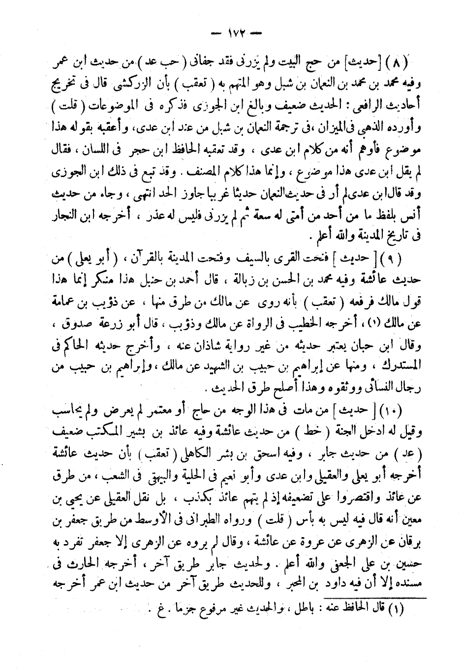 (8) [حَدِيثٌ] مَنْ حَجَّ الْبَيْتَ وَلَمْ يَزُرْنِي فَقَدْ جَفَانِي (حب عد) مِنْ حَدِيثِ ابْنِ عُمَرَ وَفِيهِ مُحَمَّد بن مُحَمَّد بن النُّعْمَان بن شبْل وَهُوَ الْمُتَّهم بِهِ (تُعُقِّبَ) بِأَنَّ الزَّرْكَشِيَّ قَالَ فِي تَخْرِيج أَحَادِيث الرَّافِعِيّ: الحَدِيث ضَعِيف وَبَالغ ابْن الْجَوْزِيّ فَذكره فِي الموضوعات (قلت) وَأوردهُ الذَّهَبِيّ فِي الْمِيزَان، فِي تَرْجَمَة النُّعْمَان بن شبْل من عِنْد ابْن عدي، وأعقبه بقوله هَذَا مَوْضُوع فأوهم أَنه من كَلَام ابْن عدي، وَقد تعقبه الْحَافِظ ابْن حجر فِي اللِّسَان، فَقَالَ لم يقل ابْن عدي هَذَا مَوْضُوع، وَإِنَّمَا هَذَا كَلَام المُصَنّف , وَقد تبع فِي ذَلِك ابْن الْجَوْزِيّ وَقد قَالَ ابْن عدي لم أر فِي حَدِيث النُّعْمَان حَدِيثا غَرِيبا جَاوز الْحَد انْتهى، وَجَاء من حَدِيث أنس بِلَفْظ مَا من أحد من أمتِي لَهُ سَعَة ثمَّ لم يزرني فَلَيْسَ لَهُ عذر، أخرجه ابْن النجار فِي تَارِيخ الْمَدِينَة وَالله أعلم.