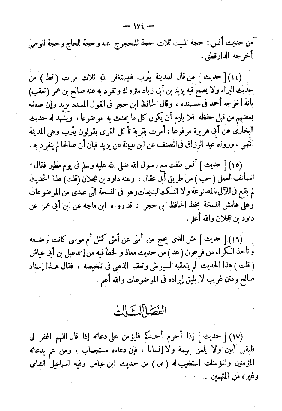 (15) [حَدِيثُ] أَنَسٍ طُفْتُ مَعَ رَسُولِ اللَّهِ فِي يَوْمٍ مَطِيرٍ فَقَالَ: اسْتَأْنِفِ الْعَمَلَ (حب) من طَرِيق أبي عقال، وَعنهُ دَاوُد بن عجلَان (قلت) هَذَا الحَدِيث لم يَقع فِي اللآلئ المصنوعة وَلَا النكت البديعات وهُوَ فِي النُّسْخَة الَّتِي عِنْدِي من الموضوعات وعَلى هَامِش النُّسْخَة خطّ الْحَافِظ ابْن حجر: قد رَوَاهُ ابْن مَاجَه عَن ابْن أبي عمر عَن دَاوُد بن عجلَان وَالله أعلم.