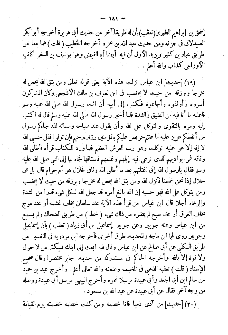 (19) [حَدِيثُ] ابْنِ عَبَّاسٍ نَزَلَتْ هَذِهِ الآيَةُ يَعْنِي قَوْلَهُ تَعَالَى: {وَمَنْ يَتَّقِ اللَّهَ يَجْعَلْ لَهُ مَخْرَجًا وَيَرْزُقْهُ مِنْ حَيْثُ لَا يحْتَسب} فِي ابْنٍ لِعَوْفِ بْنِ مَالِكٍ الأَشْجَعِيِّ وَكَانَ الْمُشْرِكُونَ أَسَرُوهُ وَأَوْثَقُوهُ وَأَجَاعُوهُ فَكَتَبَ إِلَى أَبِيهِ أَنِ ائْتِ رَسُول الله فَأَعْلِمْهُ مَا أَنَا فِيهِ مِنَ الضِّيقِ وَالشِّدَّةِ فَلَمَّا أَخْبَرَ رَسُولَ الله قَالَ لَهُ اكْتُبْ إِلَيْهِ وَمُرْهُ بِالتَّقْوَى وَالتَّوَكُّلِ عَلَى اللَّهِ وَأَنْ يَقُولَ عِنْدَ صَبَاحِهِ وَمَسَائِهِ {لَقَدْ جَاءَكُم رَسُول الله مِنْ أَنْفُسِكُمْ عَزِيزٌ عَلَيْهِ مَا عنتم حَرِيص عَلَيْكُم بِالْمُؤْمِنِينَ رؤف رَحِيمٌ} فَإِنْ تَوَلَّوْا فَقُلْ {حَسْبِيَ اللَّهُ لَا إِلَهَ إِلا هُوَ عَلَيْهِ تَوَكَّلْتُ وَهُوَ رَبُّ الْعَرْشِ الْعَظِيم} فَلَمَّا وَرَدَ الْكِتَابُ قَرَأَهُ فَأَطْلَقَ اللَّهُ وَثَاقَهُ فَمَرَّ بِوَادِيهِمُ الَّذِي تُرْعَى فِيهِ إِبِلُهُمْ وَغَنَمُهُمْ فَاسْتَاقَهَا فجَاء بهَا إِلَى النَّبِي فَقَالَ يَا رَسُولَ اللَّهِ إِنِّي اغْتَلْتُهُمْ بَعْدَ مَا أَطْلَقَ اللَّهُ وَثَاقِي فَحَلالٌ هُوَ أَمْ حَرَامٍ قَالَ بَلْ هِيَ حَلالٌ إِذَا نَحْنُ خَمَّسْنَا فَأَنْزَلَ اللَّهُ {وَمَنْ يَتَّقِ اللَّهَ يَجْعَلْ لَهُ مَخْرَجًا وَيَرْزُقْهُ مِنْ حَيْثُ لَا يَحْتَسِبُ وَمَنْ يَتَوَكَّلْ عَلَى اللَّهِ فَهُوَ حَسْبُهُ} إِنَّ اللَّهَ بَالِغُ أَمْرِهِ قَدْ جَعَلَ اللَّهُ لِكُلِّ شَيْءٍ قدرا مِنَ الشِّدَّةِ وَالرَّخَاءِ أَجَلا قَالَ ابْن عَبَّاس من قَرَأَ هَذِه الْآيَة عِنْد سُلْطَان يخَاف غشمه أَو عِنْد موج يخَاف الْغَرق أَو عِنْد سبع لم يضرّهُ من ذَلِك شَيْء (خطّ) من طَرِيق الضَّحَّاك وَلم يسمع من ابْن عَبَّاس وَعنهُ جُوَيْبِر وَعَن جُوَيْبِر إِسْمَاعِيل بن أبي زِيَاد (تعقب) بِأَن إِسْمَاعِيل وجويبر روى لَهما ابْن مَاجَه وَلِلْحَدِيثِ طرق أُخْرَى فَأخْرجهُ ابْن مرْدَوَيْه فِي التَّفْسِير من طَرِيق الْكَلْبِيّ عَن أَبِي صَالِحٍ عَنِ ابْنِ عَبَّاسٍ وَقَالَ فِيهِ ابْعَثْ إِلَى ابْنك فليكثر من لَا حول وَلَا قُوَّة إِلَّا بِاللَّه وَأخرجه الْحَاكِم فِي مُسْتَدْركه من حَدِيث جَابر مُخْتَصرا وَقَالَ صَحِيح الْإِسْنَاد (قلت) تعقبه الذَّهَبِيّ فِي تلخيصه وَضَعفه وَالله تَعَالَى أعلم.