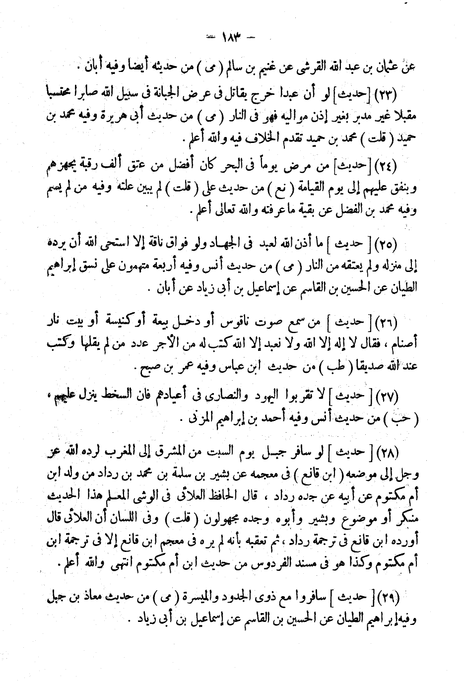 (28) [حَدِيثٌ] لَوْ سَافَرَ جَبَلٌ يَوْمَ السَّبْتِ مِنَ الْمَشْرِقِ إِلَى الْمَغْرِبِ لَرَدَّهُ اللَّهُ عَزَّ وَجَلَّ إِلَى مَوْضِعِهِ (ابْن قَانِع) فِي مُعْجَمه عَن بشير بن سَلمَة بن مُحَمَّد بن رداد من ولد ابْن أم مَكْتُوم عَن أَبِيه عَن جده رداد، قَالَ الْحَافِظ العلائي فِي الوشي الْمعلم هَذَا الحَدِيث مُنكر أَو مَوْضُوع وَبشير وَأَبوهُ وجده مَجْهُولُونَ (قلت) وَفِي اللِّسَان أَن العلائي قَالَ أوردهُ ابْن قَانِع فِي تَرْجَمَة رداد، ثمَّ تعقبه بِأَنَّهُ لم يره فِي مُعْجم ابْن قَانِع إِلَّا فِي تَرْجَمَة ابْن أم مَكْتُوم وَكَذَا هُوَ فِي مُسْند الفردوس من حَدِيث ابْن أم مَكْتُوم انْتهى وَالله أعلم.