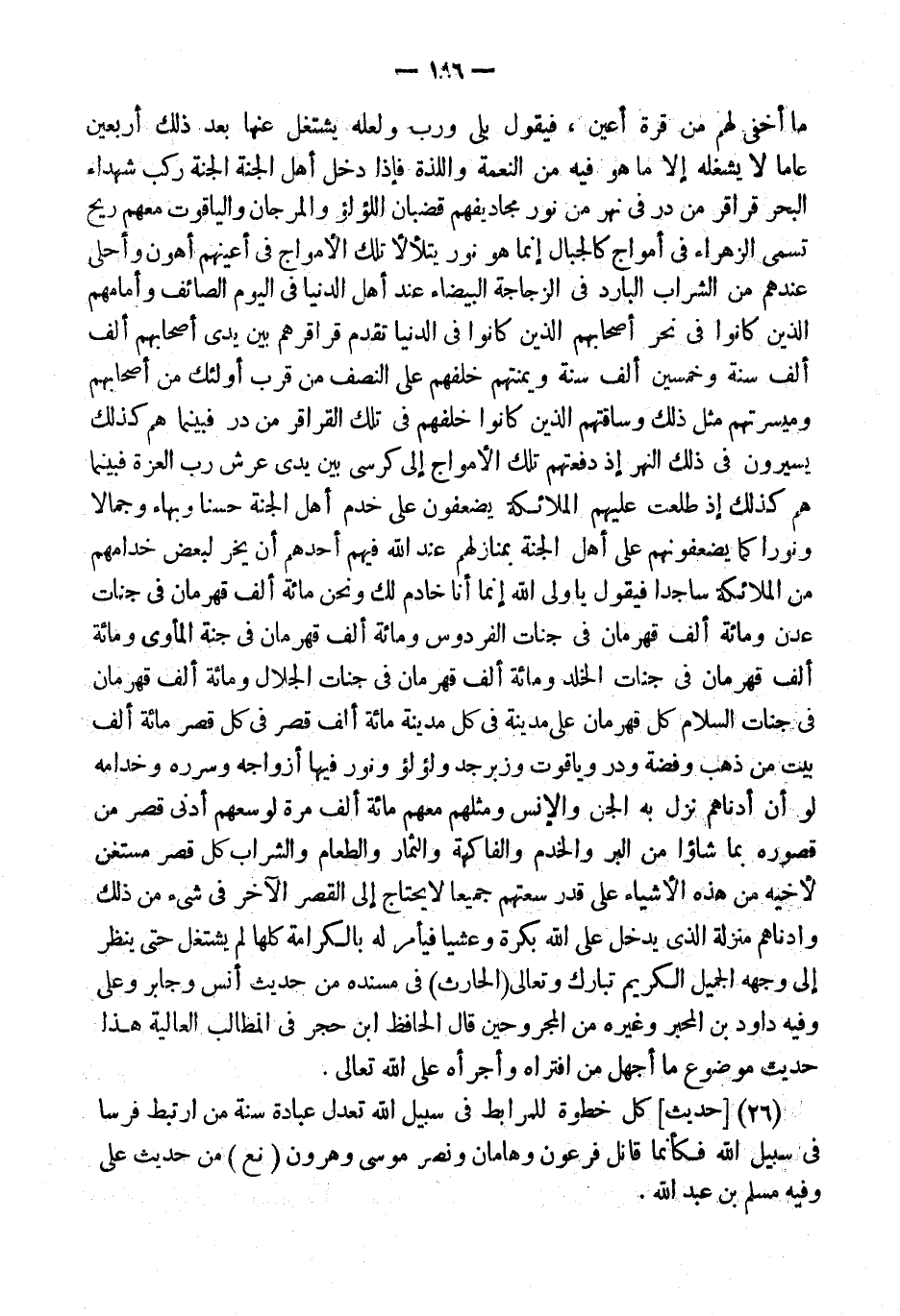 مَا أُخْفِيَ لَهُمْ مِنْ قُرَّةِ أعين) ، فَيَقُولُ بَلَى وَرَبِّ وَلَعَلَّهُ يَشْتَغِلُ عَنْهَا بَعْدَ ذَلِكَ أَرْبَعِينَ عَامًا لَا يَشْغَلُهُ إِلا مَا هُوَ فِيهِ مِنَ النِّعْمَةِ وَاللَّذَّةِ فَإِذَا دَخَلَ أَهْلُ الْجَنَّةِ الْجَنَّةَ رَكِبَ شُهَدَاءُ الْبَحْرِ قَرَاقِرَ مِنْ دُرٍّ فِي نَهْرٍ مِنْ نُورٍ مَجَادِيفُهُمْ قُضْبَانُ اللُّؤْلُؤِ وَالْمَرْجَانِ وَالْيَاقُوتِ مَعَهُمْ رِيحٌ تُسَمَّى الزَّهْرَاءَ فِي أَمْوَاجٍ كَالْجِبَالِ إِنَّمَا هُوَ نُورٌ يَتَلأْلأُ تِلْكَ الأَمْوَاجُ فِي أَعْيُنِهِمْ أَهْوَنُ وَأَحْلَى عِنْدَهُمْ مِنَ الشَّرَابِ الْبَارِدِ فِي الزُّجَاجَةِ الْبَيْضَاءِ عِنْدَ أَهْلِ الدُّنْيَا فِي الْيَوْمِ الصَّائِفِ وَأَمَامَهُمُ الَّذِينَ كَانُوا فِي نَحْرِ أَصْحَابِهِمُ الَّذِينَ كَانُوا فِي الدُّنْيَا تَقْدَمُ قَرَاقِرُهُمْ بَيْنَ يَدَيْ أَصْحَابِهِمْ أَلْفَ أَلْفِ سَنَةٍ وَخَمْسِينَ أَلْفِ سَنَةٍ وَيَمْنَتُهُمْ خَلْفَهُمْ عَلَى النِّصْفِ مِنْ قُرْبِ أُولَئِكَ مِنْ أَصْحَابِهِمْ وَمَيْسَرَتُهُمْ مِثْلُ ذَلِكَ وَسَاقَتُهُمُ الَّذِينَ كَانُوا خَلْفَهُمْ فِي تِلْكَ الْقَرَاقِرِ مِنْ دُرٍّ فَبَيْنَمَا هُمْ كَذَلِكَ يَسِيرُونَ فِي ذَلِكَ النَّهْرِ إِذْ دَفَعَتْهُمْ تِلْكَ الأَمْوَاجُ إِلَى كُرْسِيٍّ بَيْنَ يَدَيْ عَرْشِ رَبِّ الْعِزَّةِ فَبَيْنَمَا هُمْ كَذَلِكَ إِذْ طَلَعَتْ عَلَيْهِمُ الْمَلائِكَةُ يُضْعِفُونَ عَلَى خَدَمِ أَهْلِ الْجَنَّةِ حُسْنًا وَبَهَاءً وَجَمَالا وَنُورًا كَمَا يُضْعِفُونَهُمْ عَلَى أَهْلِ الْجَنَّةِ بِمَنَازِلِهِمْ عِنْدَ اللَّهِ فَيَهُمُّ أَحَدُهُمْ أَنْ يَخِرُّ لِبَعْضِ خُدَّامِهِمْ مِنَ الْمَلائِكَةِ سَاجِدًا فَيَقُولُ يَا وَلِيَّ اللَّهِ إِنَّمَا أَنَا خَادِمٌ لَكَ وَنَحْنُ مِائَةُ أَلْفِ قَهْرَمَانٍ فِي جَنَّاتِ عَدْنٍ وَمِائَةُ أَلْفِ قَهْرَمَانٍ فِي جَنَّاتِ الْفِرْدَوْسِ وَمِائَةُ أَلْفِ قَهْرَمَانٍ فِي جَنَّةِ الْمَأْوَى وَمِائَةُ أَلْفِ قَهْرَمَانٍ فِي جَنَّاتِ الْخُلْدِ وَمِائَةُ أَلْفِ قَهْرَمَانٍ فِي جَنَّاتِ الْجَلالِ وَمِائَةُ أَلْفِ قَهْرَمَانٍ فِي جَنَّاتِ السَّلامِ كُلُّ قَهْرَمَانٍ عَلَى مَدِينَةٍ فِي كُلِّ مَدِينَةٍ مِائَةُ أَلْفَ قَصْرٍ فِي كُلِّ قَصْرٍ مِائَةُ أَلْفِ بَيْتٍ مِنْ ذَهَبٍ وَفِضَّةٍ وَدُرٍّ وَيَاقُوتٍ وَزَبَرْجَدٍ وَلُؤْلُؤٍ وَنُورٍ فِيهَا أَزْوَاجُهُ وَسُرُرُهُ وَخُدَّامُهُ لَوْ أَنَّ أَدْنَاهُمْ نَزَلَ بِهِ الْجِنُّ وَالإِنْسُ وَمِثْلُهُمْ مَعَهُمْ مِائَةَ أَلْفِ مَرَّةٍ لَوِسَعَهُمْ أَدْنَى قَصْرٌ من قصوره بِمَا شاؤا مِنَ الْبُرِّ وَالْخَدَمِ وَالْفَاكِهَةِ وَالثِّمَارِ وَالطَّعَامِ وَالشَّرَابِ كُلُّ قَصْرٌ مُسْتَغْنٍ لأَخِيهِ مِنْ هَذِهِ الأَشْيَاءِ عَلَى قَدْرِ سَعَتَهِمْ جَمِيعًا لَا يَحْتَاجُ إِلَى الْقَصْرِ الآخَرِ فِي شَيْءٍ مِنْ ذَلِكَ وَأَدْنَاهُمْ مَنْزِلَةً الَّذِي يَدْخُلُ عَلَى اللَّهِ بُكْرَةً وَعَشِيًّا فَيَأْمُرُ لَهُ بِالْكَرَامَةِ كُلِّهَا لَمْ يَشْتَغِلْ حَتَّى يَنْظُرَ إِلَى وَجْهِهِ الْجَمِيلِ الْكَرِيمِ تَبَارَكَ وَتَعَالَى (الْحَارِث) فِي مُسْنده من حَدِيث أنس وَجَابِر وَعلي وَفِيه دَاوُد بن المحبر وَغَيره من الْمَجْرُوحين قَالَ الْحَافِظ ابْن حجر فِي المطالب الْعَالِيَة هَذَا حَدِيث مَوْضُوع مَا أَجْهَل من افتراه وأجرأه على الله تَعَالَى.