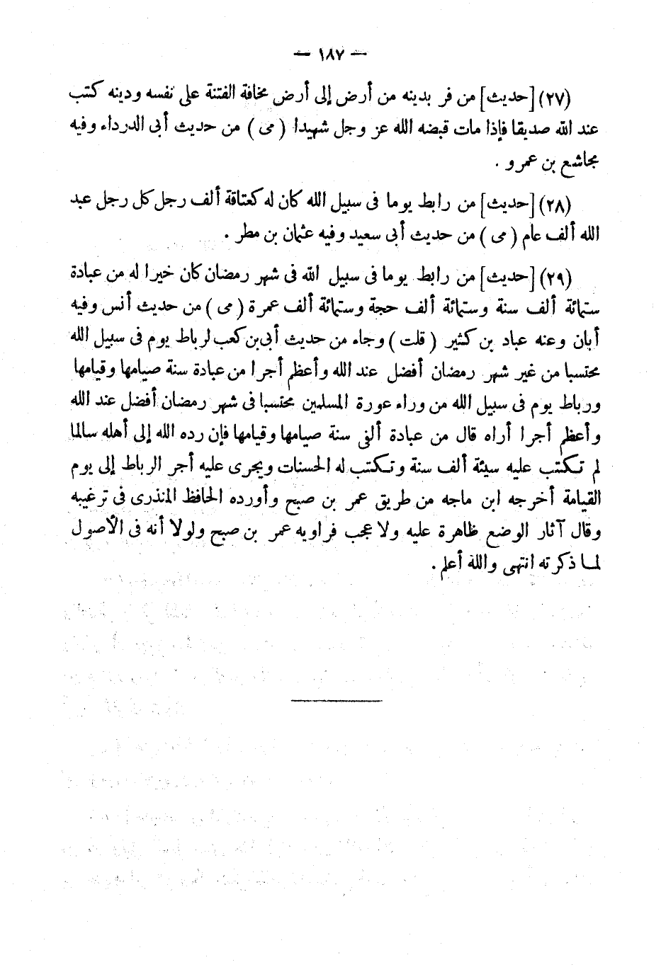 (29) [حَدِيثٌ] مَنْ رَابَطَ يَوْمًا فِي سَبِيلِ اللَّهِ فِي شَهْرِ رَمَضَانَ كَانَ خَيْرًا لَهُ من عبَادَة سِتّمائَة ألف سنة وسِتمِائَة ألف حجَّة وسِتمِائَة أَلْفِ عُمْرَةٍ (مي) من حَدِيث أنس وَفِيه أبان وَعنهُ عباد بن كثير (قلت) وَجَاء من حَدِيث أبي بن كَعْب لرباط يَوْم فِي سَبِيل الله محتسبا من غير شهر رَمَضَان أفضل عِنْد الله وَأعظم أجرا من عبَادَة سنة صيامها وقيامها ورباط يَوْم فِي سَبِيل الله من وَرَاء عَورَة الْمُسلمين محتسبا فِي شهر رَمَضَان أفضل عِنْد الله وَأعظم أجرا أرَاهُ قَالَ من عبَادَة ألفي سنة صيامها وقيامها فَإِن رده الله إِلَى أَهله سالما لم تكْتب عَلَيْهِ سَيِّئَة ألف سنة وتكتب لَهُ الْحَسَنَات ويجرى عَلَيْهِ أجر الرِّبَاط إِلَى يَوْم الْقِيَامَة أخرجه ابْن مَاجَه من طَرِيق عمر بن صبح وَأوردهُ الْحَافِظ الْمُنْذِرِيّ فِي ترغيبه وَقَالَ آثَار الْوَضع ظَاهِرَة عَلَيْهِ وَلَا عجب فراويه عمر بن صبح وَلَوْلَا أَنه فِي الْأُصُول لما ذكرته انْتهى وَالله أعلم.