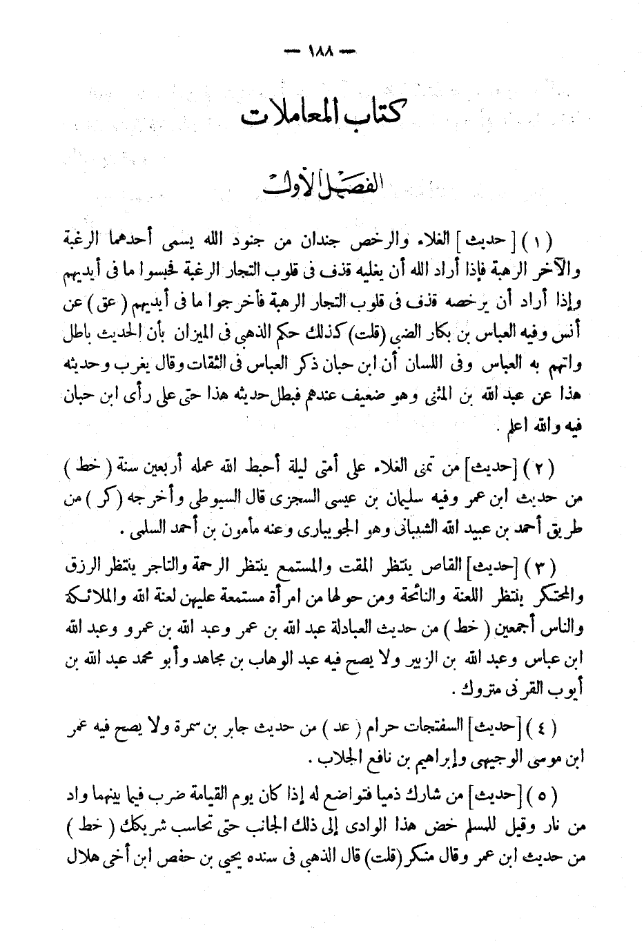 (1) [حَدِيثٌ] الْغَلاءُ وَالرُّخْصُ جُنْدَانِ مِنْ جُنُودِ اللَّهِ يُسَمَّى أَحَدُهُمَا الرَّغْبَةَ وَالآخَرُ الرَّهْبَةُ فَإِذَا أَرَادَ اللَّهُ أَنْ يُغَلِّيَهُ قَذَفَ فِي قُلُوبِ التُّجَّارِ الرَّغْبَةَ فَحَبَسُوا مَا فِي أَيْدِيهِمْ وَإِذَا أَرَادَ أَنْ يُرَخِّصَهُ قَذَفَ فِي قُلُوبِ التُّجَّارِ الرهبة فأخرجوا مَا فِي أَيّدهُم (عق) عَن أنس وَفِيه الْعَبَّاس بن بكار الضَّبِّيّ (قلت) كَذَلِك حكم الذَّهَبِيّ فِي الْمِيزَان بِأَن الحَدِيث بَاطِل واتهم بِهِ الْعَبَّاس وَفِي اللِّسَان أَن ابْن حبَان ذكر الْعَبَّاس فِي الثِّقَات وَقَالَ يغرب وَحَدِيثه هَذَا عَن عبد الله بن الْمثنى وَهُوَ ضَعِيف عِنْدهم فَبَطل حَدِيثه هَذَا حَتَّى على رَأْي ابْن حبَان فِيهِ وَالله أعلم.