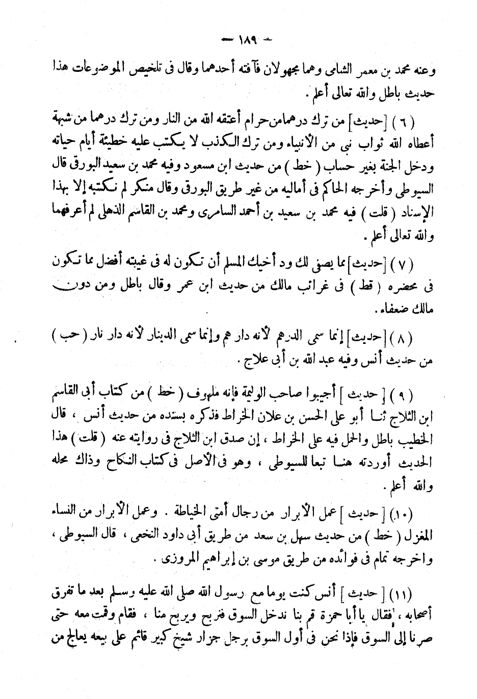 (9) [حَدِيثٌ] أَجِيبُوا صَاحِبَ الْوَلِيمَةِ فَإِنَّهُ مَلْهُوفٌ (خطّ) من كتاب أبي الْقَاسِم ابْن الثلاج ثَنَا أَبُو عَليّ الْحسن بن عَلان الْخَرَّاط فَذكره بِسَنَدِهِ من حَدِيث أنس، قَالَ الْخَطِيب بَاطِل وَالْحمل فِيهِ على الْخَرَّاط، إِن صدق ابْن الثلاج فِي رِوَايَته عَنهُ (قلت) هَذَا الحَدِيث أوردته هُنَا تبعا للسيوطي، وَهُوَ فِي الأَصْل فِي كتاب النِّكَاح وَذَاكَ مَحَله وَالله أعلم.