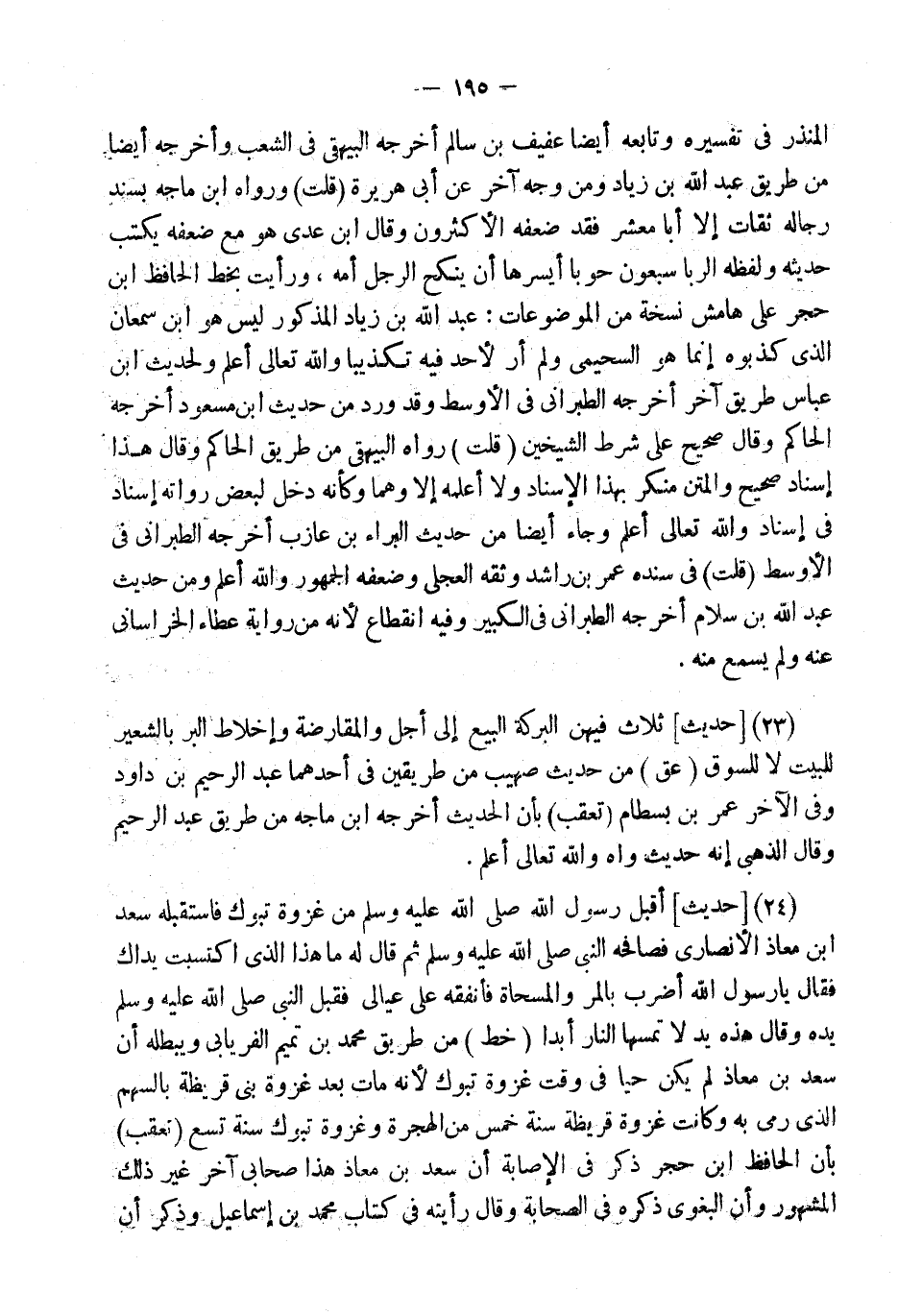(24) [حَدِيثٌ] أَقْبَلَ رَسُولُ اللَّهِ مِنْ غَزْوَةِ تَبُوكَ فَاسْتَقْبَلَهُ سَعْدُ ابْن معَاذ الْأنْصَارِيّ فصافحه النَّبِي ثُمَّ قَالَ لَهُ مَا هَذَا الَّذِي اكْتَسَبَتْ يَدَاكَ فَقَالَ يَا رَسُولُ اللَّهِ أَضْرِبُ بِالْمُرِّ وَالْمِسْحَاةِ فَأُنْفِقُهُ عَلَى عِيَالِي فَقَبَّلَ النَّبِيُّ يَدَهُ وَقَالَ هَذِهِ يَدٌ لَا تَسَمُّهَا النَّارُ أَبَدًا (خطّ) من طَرِيق مُحَمَّد بن تَمِيم الْفرْيَابِيّ ويبطله أَن سعد بن معَاذ لم يكن حَيا فِي وَقت غَزْوَة تَبُوك لِأَنَّهُ مَاتَ بعد غَزْوَة بني قُرَيْظَة بِالسَّهْمِ الَّذِي رمى بِهِ وَكَانَت غَزْوَة قُرَيْظَة سنة خمس من الْهِجْرَة وغزوة تَبُوك سنة تسع (تعقب) بِأَن الْحَافِظ ابْن حجر ذكر فِي الْإِصَابَة أَن سعد بن معَاذ هَذَا صَحَابِيّ آخر غير ذَلِك الْمَشْهُور وَأَن الْبَغَوِيّ ذكره فِي الصَّحَابَة وَقَالَ رَأَيْته فِي كتاب مُحَمَّد بن إِسْمَاعِيل وَذكر أَن