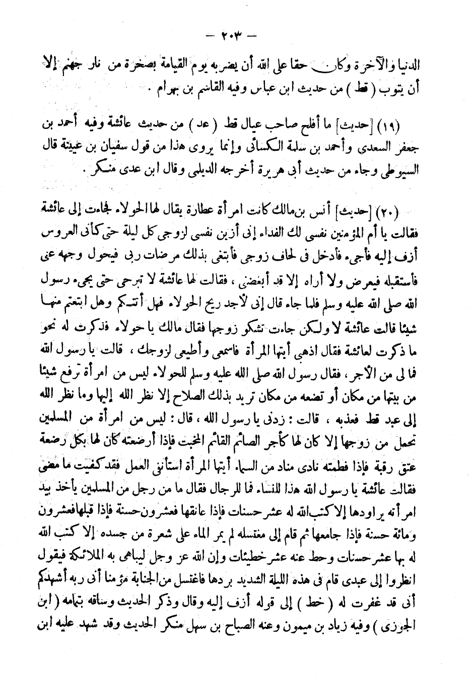 (20) [حَدِيثُ] أَنَسِ بْنِ مَالِكٍ كَانَتِ امْرَأَةٌ عَطَّارَةً يُقَالُ لَهَا الْحَولاءُ فَجَاءَتْ إِلَى عَائِشَةَ فَقَالَتْ يَا أُمَّ الْمُؤْمِنِينَ نَفْسِي لَكِ الْفِدَاءُ إِنِّي أُزَيِّنُ نَفْسِي لِزَوْجِي كُلَّ لَيْلَةٍ حَتَّى كَأَنِّي الْعَرُوسُ أزف إِلَيْهِ فأجئ فَأَدْخُلُ فِي لِحَافِ زَوْجِي فَأَبْتَغِي بِذَلِكَ مَرْضَاتِ رَبِّي فَيُحَوِّلُ وَجْهَهُ عَنِّي فَأَسْتَقْبِلُهُ فَيُعْرِضُ وَلا أَرَاهُ إِلا قَدْ أَبْغَضَنِي، فَقَالَتْ لَهَا عَائِشَةُ لَا تَبْرَحِي حَتَّى يَجِيءَ رَسُول الله فَلَمَّا جَاءَ قَالَ إِنِّي لأَجِد رِيحَ الْحَوْلاءِ فَهَلْ أَتَتْكُمْ وَهَلِ ابْتَعْتُمْ مِنْهَا شَيْئًا قَالَتْ عَائِشَةُ لَا وَلَكِنْ جَاءَتْ تَشْكُو زَوْجَهَا فَقَالَ مَالك يَا حَوْلاءُ فَذَكَرَتْ لَهُ نَحْوَ مَا ذَكَرَتْ لِعَائِشَةَ فَقَالَ اذْهَبِي أَيَّتُهَا الْمَرْأَةُ فَاسْمَعِي وَأَطِيعِي لِزَوْجِكِ، قَالَتْ يَا رَسُولَ اللَّهِ فَمَا لِي مِنَ الأَجْرِ، فَقَالَ رَسُولُ الله لِلْحَوْلاءِ لَيْسَ مِنَ امْرَأَةٍ تَرْفَعُ شَيْئًا مِنْ بَيْتِهَا مِنْ مَكَانٍ أَوْ تَضَعُهُ مِنْ مَكَانٍ تُرِيدُ بِذَلِكَ الصَّلاحَ إِلا نَظَرَ اللَّهُ إِلَيْهَا وَمَا نَظَرَ اللَّهُ إِلَى عَبْدٍ قَطُّ فَعَذَّبَهُ، قَالَتْ: زِدْنِي يَا رَسُولَ اللَّهِ، قَالَ: لَيْسَ مِنَ امْرَأَةٍ مِنَ الْمُسْلِمِينَ تَحْمِلُ مِنْ زَوْجِهَا إِلا كَانَ لَهَا كَأَجْرِ الصَّائِمِ الْقَائِمِ الْمُخْبِتِ فَإِذَا أَرْضَعَتْهُ كَانَ لَهَا بِكُلِّ رَضْعَةٍ عِتْقُ رَقَبَةٍ فَإِذَا فَطَمَتْهُ نَادَى مُنَادٍ مِنَ السَّمَاءِ أَيَّتُهَا الْمَرْأَةُ اسْتَأْنِفِي الْعَمَلَ فَقَدْ كُفِيتِ مَا مَضَى فَقَالَتْ عَائِشَةُ يَا رَسُولَ اللَّهِ هَذَا لِلنِّسَاءِ فَمَا لِلرِّجَالِ فَقَالَ مَا مِنْ رَجُلٍ مِنَ الْمُسْلِمِينَ يَأْخُذُ بِيَدِ امْرَأَتِهِ يُرَاوِدُهَا إِلا كَتَبَ اللَّهُ لَهُ عَشْرَ حَسَنَاتٍ فَإِذَا عَانَقَهَا فَعِشْرُونَ حَسَنَةً فَإِذَا قَبَّلَهَا فَعِشْرُونَ وَمِائَةُ حَسَنَةٍ فَإِذَا جَامَعَهَا ثُمَّ قَامَ إِلَى مُغْتَسَلِهِ لَمْ يَمُرَّ الْمَاءُ عَلَى شَعْرَةٍ مِنْ جَسَدِهِ إِلا كَتَبَ اللَّهُ لَهُ بِهَا عَشْرَ حَسَنَاتٍ وَحَطَّ عَنْهُ عَشْرَ خَطِيئَاتٍ وَإِنَّ اللَّهَ عَزَّ وَجَلَّ لَيُبَاهِي بِهِ الْمَلائِكَةَ فَيَقُولُ انْظُرُوا إِلَى عَبْدِي قَامَ فِي هَذِهِ اللَّيْلَةِ الشَّدِيدِ بَرْدُهَا فَاغْتَسَلَ مِنَ الْجَنَابَةِ مُؤْمِنًا أَنِّي رَبُّهُ أُشْهِدُكُمْ أَنِّي قَدْ غَفَرْتُ لَهُ (خطّ) إِلَى قَوْله أزف إِلَيْهِ وَقَالَ وَذكر الحَدِيث وَسَاقه بِتَمَامِهِ (ابْن الْجَوْزِيّ) وَفِيه زِيَاد بن مَيْمُون وَعنهُ الصَّباح بن سهل مُنكر الحَدِيث وَقد شهد عَلَيْهِ ابْن