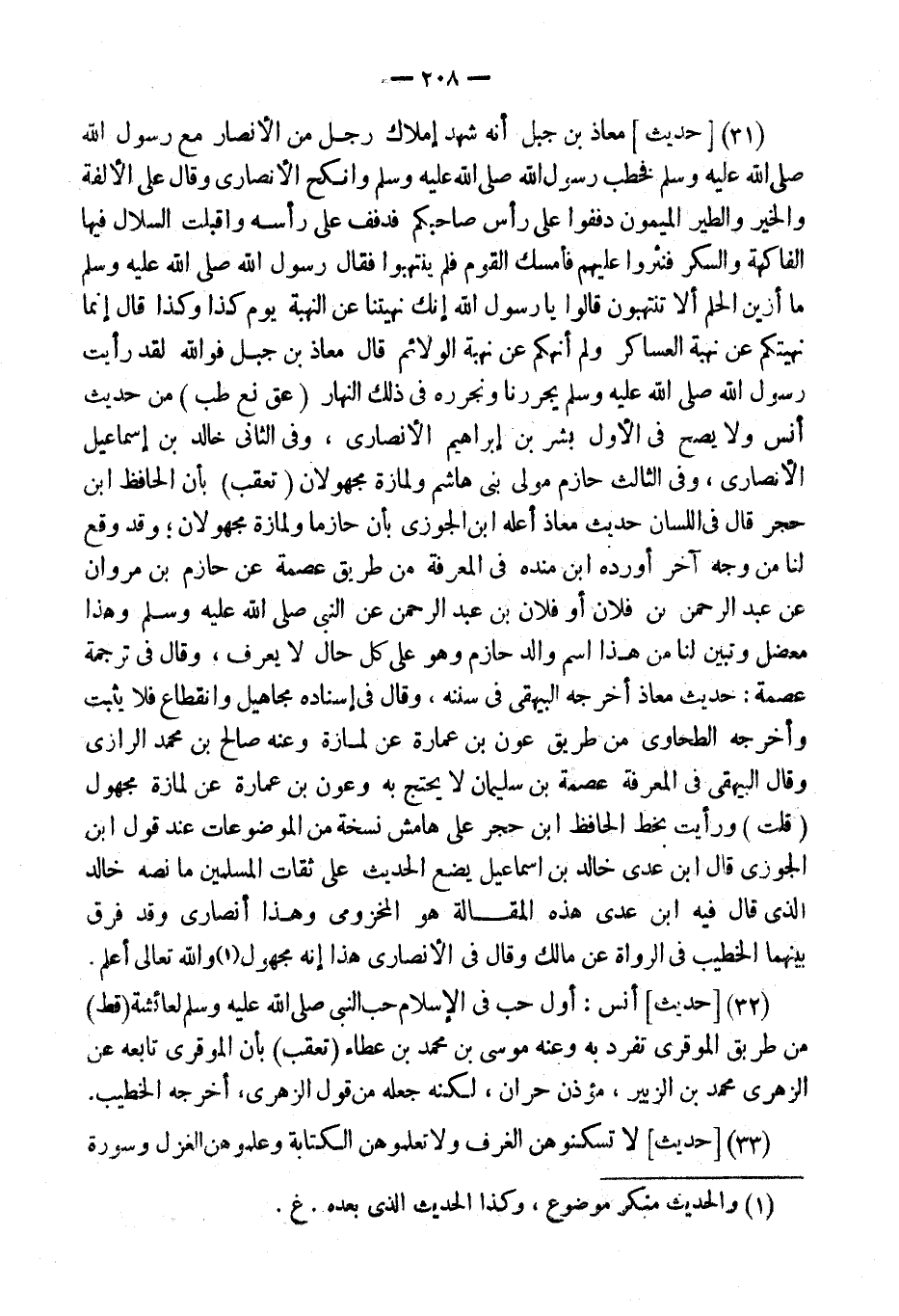 (31) [حَدِيثُ] مُعَاذِ بْنِ جَبَلٍ أَنَّهُ شَهِدَ إِمْلاكَ رَجُلٍ مِنَ الأَنْصَارِ مَعَ رَسُول الله فَخَطب رَسُول الله وَأَنْكَحَ الأَنْصَارِيَّ وَقَالَ عَلَى الأُلْفَةِ وَالْخَيْرِ وَالطَّيْرِ الْمَيْمُونِ دَفِّفُوا عَلَى رَأْسِ صَاحِبِكُمْ فَدُفِّفَ عَلَى رَأْسِهِ وَأَقْبَلَتِ السِّلالُ فِيهَا الْفَاكِهَةُ وَالسُّكَّرُ فَنَثَرُوا عَلَيْهِ فَأَمْسَكَ الْقَوْمُ فَلَمْ ينتهبوا فَقَالَ رَسُول الله مَا أَزْيَنَ الْحِلْمَ أَلا تَنْتَهِبُونَ قَالُوا يَا رَسُولَ اللَّهِ إِنَّكَ نَهَيْتَنَا عَنِ النُّهْبَةِ يَوْمَ كَذَا وَكَذَا قَالَ إِنَّمَا نَهَيْتُكُمْ عَنِ نهبة العساكر لم أَنْهَكُمْ عَنْ نُهْبَةِ الْوَلائِمِ قَالَ معَاذ بن جبل فوَاللَّه لقد رَأَيْت رَسُول الله يجررنا ونجرره فِي ذَلِك النَّهَار (عق نع طب) من حَدِيث أنس وَلَا يَصح فِي الأول بشر بن إِبْرَاهِيم الْأنْصَارِيّ، وَفِي الثَّانِي خَالِد بن إِسْمَاعِيل الْأنْصَارِيّ، وَفِي الثَّالِث حَازِم مولى بني هَاشم ولمازة مَجْهُولَانِ (تعقب) بِأَن الْحَافِظ ابْن حجر قَالَ فِي اللِّسَان حَدِيث معَاذ أعله ابْن الْجَوْزِيّ بِأَن حازما ولمازة مَجْهُولَانِ؛ وَقد وَقع لنا من وَجه آخر أوردهُ ابْن مَنْدَه فِي الْمعرفَة من طَرِيق عصمَة عَن حَازِم بن مَرْوَان عَن عبد الرَّحْمَن بن فلَان أَو فلَان بن عبد الرَّحْمَن عَن النَّبِي وَهَذَا معضل وَتبين لنا من هَذَا اسْم وَالِد حَازِم وَهُوَ على كل حَال لَا يعرف، وَقَالَ فِي تَرْجَمَة عصمَة: حَدِيث معَاذ أخرجه الْبَيْهَقِيّ فِي سنَنه، وَقَالَ فِي إِسْنَاده مَجَاهِيل وَانْقِطَاع فَلَا يثبت وَأخرجه الطَّحَاوِيّ من طَرِيق عون بن عمَارَة عَن لمازة وَعنهُ صَالح بن مُحَمَّد الرَّازِيّ وَقَالَ الْبَيْهَقِيّ فِي الْمعرفَة عصمَة بن سُلَيْمَان لَا يحْتَج بِهِ وَعون بن عمَارَة عَن لمازة مَجْهُول (قلت) وَرَأَيْت بِخَط الْحَافِظ ابْن حجر على هَامِش نُسْخَة من الموضوعات عِنْد قَول ابْن الْجَوْزِيّ قَالَ ابْن عدي خَالِد بن إِسْمَاعِيل يضع الحَدِيث على ثِقَات الْمُسلمين مَا نَصه خَالِد الَّذِي قَالَ فِيهِ ابْن عدي هَذِه الْمقَالة هُوَ المَخْزُومِي وَهَذَا أَنْصَارِي وَقد فرق بَينهمَا الْخَطِيب فِي الروَاة عَن مَالك وَقَالَ فِي الْأنْصَارِيّ هَذَا إِنَّه مَجْهُول وَالله تَعَالَى أعلم.