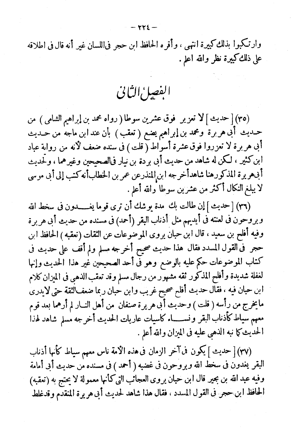 (36) [حَدِيثٌ] إِنْ طَالَتْ بِكَ مُدَّةٌ يُوشِكُ أَنْ تَرَى قَوْمًا يَغْدُونَ فِي سَخَطِ اللَّهِ وَيَرُوحُونَ فِي لعنته فِي أَيّدهُم مِثْلُ أَذْنَابِ الْبَقَرِ (أَحْمد) فِي مُسْنده من حَدِيث أبي هُرَيْرَة وَفِيه أَفْلح بن سعيد، قَالَ ابْن حبَان يروي الموضوعات عَن الثِّقَات (تعقبه) الْحَافِظ ابْن حجر فِي القَوْل المسدد فَقَالَ هَذَا حَدِيث صَحِيح أخرجه مُسلم وَلم أَقف على حَدِيث فِي كتاب الموضوعات حكم عَلَيْهِ بِالْوَضْعِ وَهُوَ فِي أحد الصَّحِيحَيْنِ غير هَذَا الحَدِيث وَإِنَّهَا لغفلة شَدِيدَة وأفلح الْمَذْكُور ثِقَة مَشْهُور من رجال مُسلم وَقد تعقب الذَّهَبِيّ فِي الْمِيزَان كَلَام ابْن حبَان فِيهِ، فَقَالَ حَدِيث أَفْلح صَحِيح غَرِيب وَابْن حبَان رُبمَا ضعف الثِّقَة حَتَّى لَا يدْرِي مَا يخرج من رَأسه (قلت) وَحَدِيث أبي هُرَيْرَة صنفان من أهل النَّار لم أرهما بعد قوم مَعَهم سياط كأذناب الْبَقر وَنسَاء كاسيات عاريات الحَدِيث أخرجه مُسلم شَاهد لهَذَا الحَدِيث كَمَا نبه الذَّهَبِيّ عَلَيْهِ فِي الْمِيزَان وَالله أعلم.