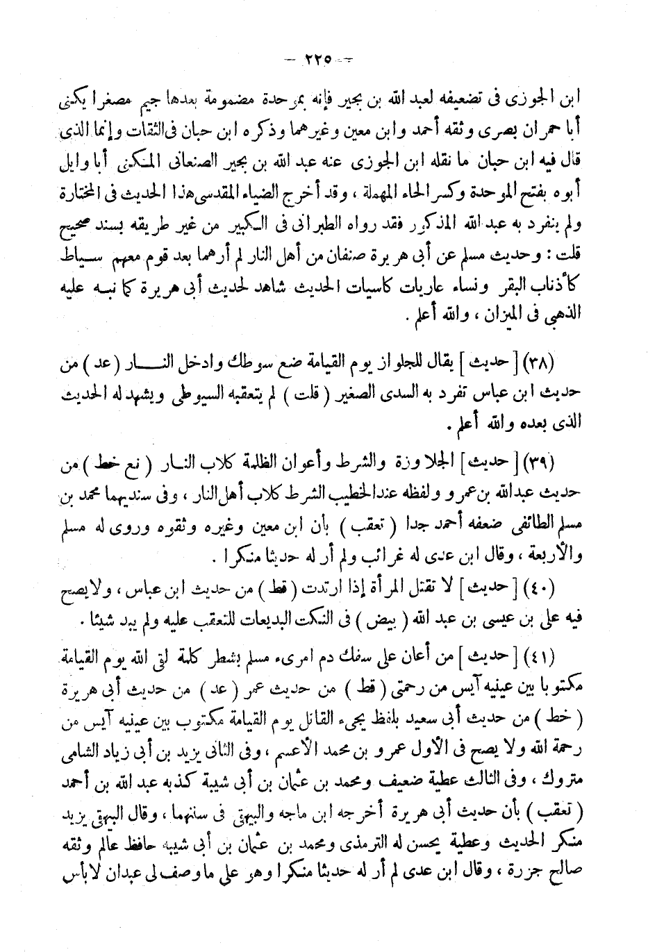 (40) [حَدِيثٌ] لَا تُقْتَلُ الْمَرْأَةُ إِذَا ارْتَدَّتْ (قطّ) من حَدِيث ابْن عَبَّاس، وَلَا يَصح فِيهِ عَليّ بن عِيسَى بن عبد الله (بيض) فِي النكت البديعات للتعقب عَلَيْهِ وَلم يبد شَيْئا.