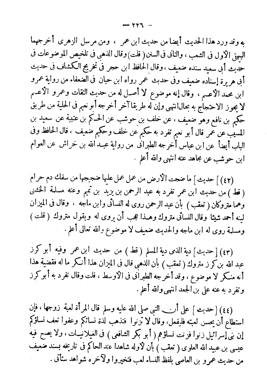 (42) [حَدِيثٌ] مَا ضَجَّتِ الأَرْضُ مِنْ عَمَلٍ عُمِلَ عَلَيْهَا ضَجِيجَهَا مِنْ سَفْكِ دَمٍ حَرَامٍ (قطّ) من حَدِيث ابْن عمر تفرد بِهِ عبد الرَّحْمَن بن يزِيد بن تَمِيم وَعنهُ مسلمة الْخُشَنِي وهما مَتْرُوكَانِ (تعقب) بِأَن عبد الرَّحْمَن روى لَهُ النَّسَائِيّ وَابْن مَاجَه، وَقَالَ فِي الْمِيزَان لينه أَحْمد شَيْئا وَقَالَ النَّسَائِيّ مَتْرُوك وَهَذَا عجب أَن يروي لَهُ وَيَقُول مَتْرُوك (قلت) ومسلمة روى لَهُ ابْن مَاجَه والْحَدِيث ضَعِيف لَا مَوْضُوع وَالله تَعَالَى أعلم.