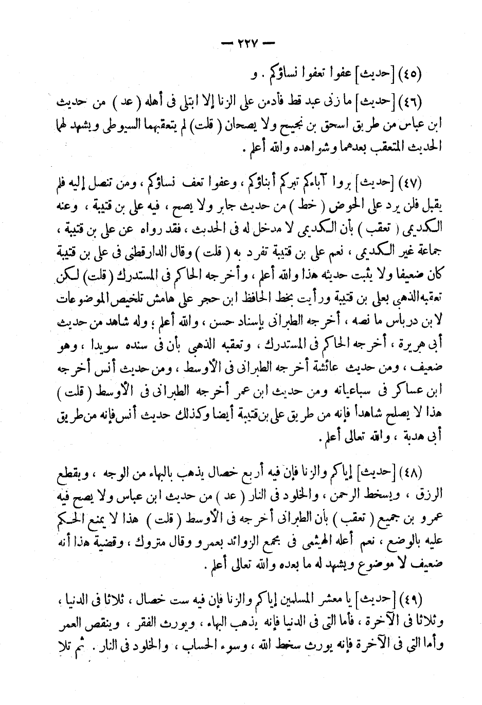 (48) [حَدِيثٌ] إِيَّاكُمْ وَالزِّنَا فَإِنَّ فِيهِ أَرْبَعَ خِصَالٍ يُذْهِبُ بِالْبَهَاءِ مِنَ الْوَجْهِ، وَيَقْطَعُ الرِّزْقَ، وَيُسْخِطُ الرَّحْمَنَ، وَالْخُلُودَ فِي النَّارِ (عد) من حَدِيث ابْن عَبَّاس وَلَا يَصح فِيهِ عَمْرو بن جَمِيع (تعقب) بِأَن الطَّبَرَانِيّ أخرجه فِي الْأَوْسَط (قلت) هَذَا لَا يمْنَع الحكم عَلَيْهِ بِالْوَضْعِ، نعم أعله الهيثمي فِي مجمع الزَّوَائِد بِعَمْرو وَقَالَ مَتْرُوك، وَقَضِيَّة هَذَا أَنه ضَعِيف لَا مَوْضُوع وَيشْهد لَهُ مَا بعده وَالله تعال أعلم.