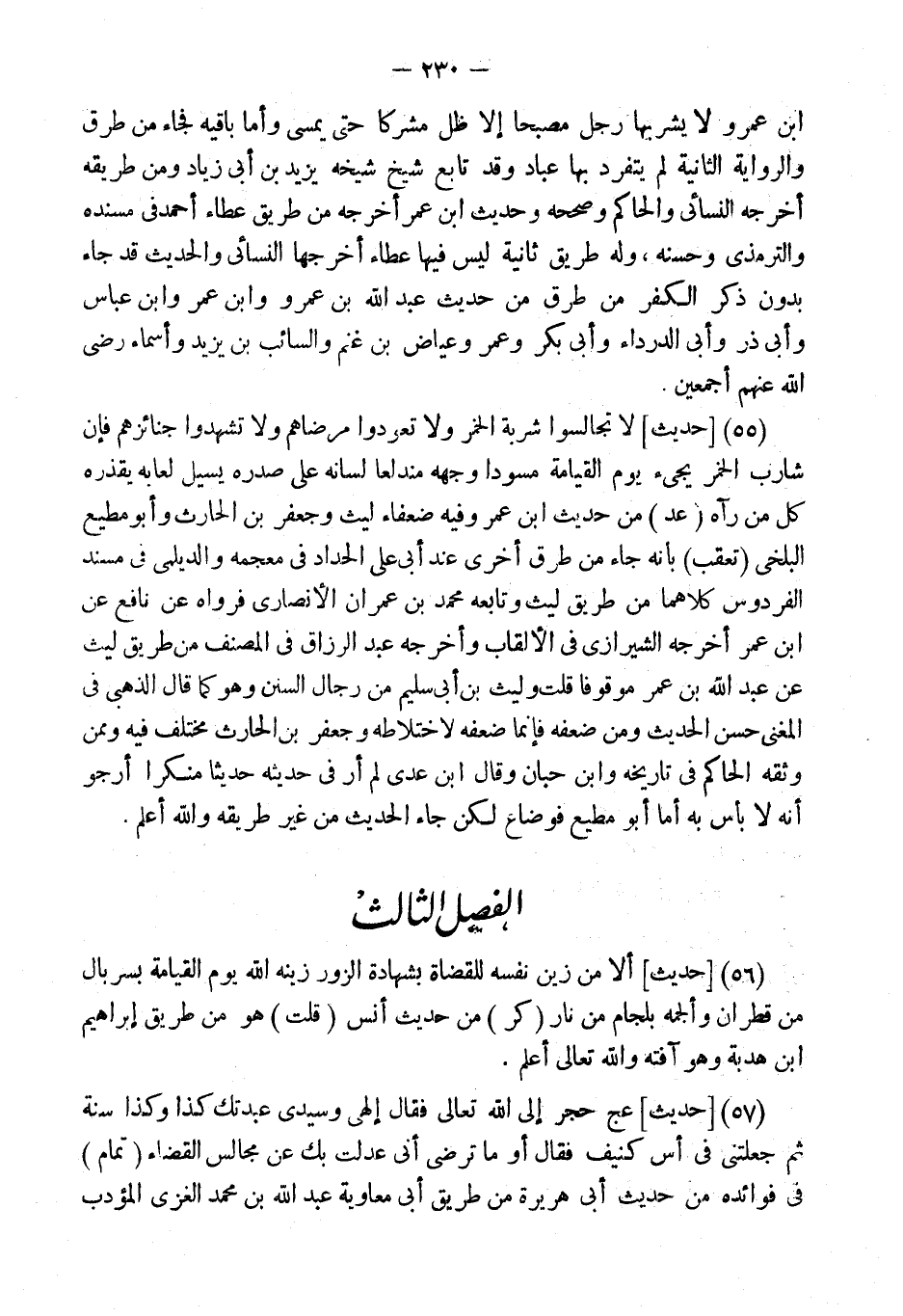 (55) [حَدِيثٌ] لَا تُجَالِسُوا شَرَبَةَ الْخَمْرِ وَلا تَعُودُوا مَرْضَاهُمْ وَلا تَشْهَدُوا جَنَائِزَهُمْ فَإِنَّ شَارِبَ الْخَمْرِ يَجِيءُ يَوْمَ الْقِيَامَةِ مُسْوَدًّا وَجْهُهُ مُنْدَلِعًا لِسَانُهُ عَلَى صَدْرِهِ يَسِيلُ لُعَابُهُ يَقْذَرُهُ كُلُّ مَنْ رَآهُ (عد) مِنْ حَدِيثِ ابْنِ عُمَرَ وَفِيه ضعفاء لَيْث وجعفر بن الْحَارِث وَأَبُو مُطِيع الْبَلْخِي (تعقب) بِأَنَّهُ جَاءَ من طرق أُخْرَى عِنْد أبي عَليّ الْحداد فِي مُعْجَمه والديلمي فِي مُسْند الفردوس كِلَاهُمَا من طَرِيق لَيْث وَتَابعه مُحَمَّد بن عمرَان الْأنْصَارِيّ فَرَوَاهُ عَن نَافِع عَن ابْن عمر أخرجه الشِّيرَازِيّ فِي الألقاب وَأخرجه عبد الرَّزَّاق فِي المُصَنّف من طَرِيق لَيْث عَن عبد الله بن عمر مَوْقُوفا قلت وَلَيْث بن أبي سليم من رجال السّنَن وَهُوَ كَمَا قَالَ الذَّهَبِيّ فِي الْمُغنِي حسن الحَدِيث وَمن ضعفه فَإِنَّمَا ضعفه لاختلاطه وجعفر بن الْحَارِث مُخْتَلف فِيهِ وَمِمَّنْ وَثَّقَهُ الْحَاكِم فِي تَارِيخه وَابْن حبَان وَقَالَ ابْن عدي لم أر فِي حَدِيثه حَدِيثا مُنْكرا أرَجْو أَنَّهُ لَا بَأْسَ بِهِ أما أَبُو مُطِيع فوضاع لَكِن جَاءَ الحَدِيث من غير طَرِيقه وَاللَّهُ أَعَلُم.