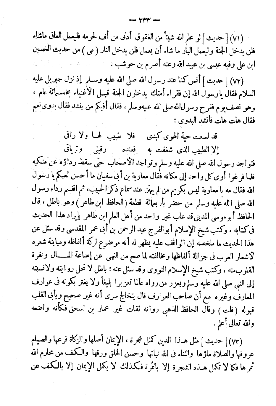 (72) [حَدِيثٌ] أَنَسٍ كُنَّا عِنْدَ رَسُولِ الله إِذْ نَزَلَ جِبْرِيلُ عَلَيْهِ السَّلامُ فَقَالَ يَا رَسُولَ اللَّهِ إِنَّ فُقَرَاءَ أُمَّتِكَ يَدْخُلُونَ الْجَنَّةَ قَبْلَ الْأَغْنِيَاء بِخَمْسِمِائَة عَامٍ؛ وَهُوَ نِصْفُ يَوْمٍ فَفَرِحَ رَسُول الله، فَقَالَ أَفِيكُمْ مَنْ يُنْشِدُ فَقَالَ بَدَوِيٌّ نَعَمْ فَقَالَ هَاتِ هَاتِ فَأَنْشَدَ الْبَدَوِيُّ: