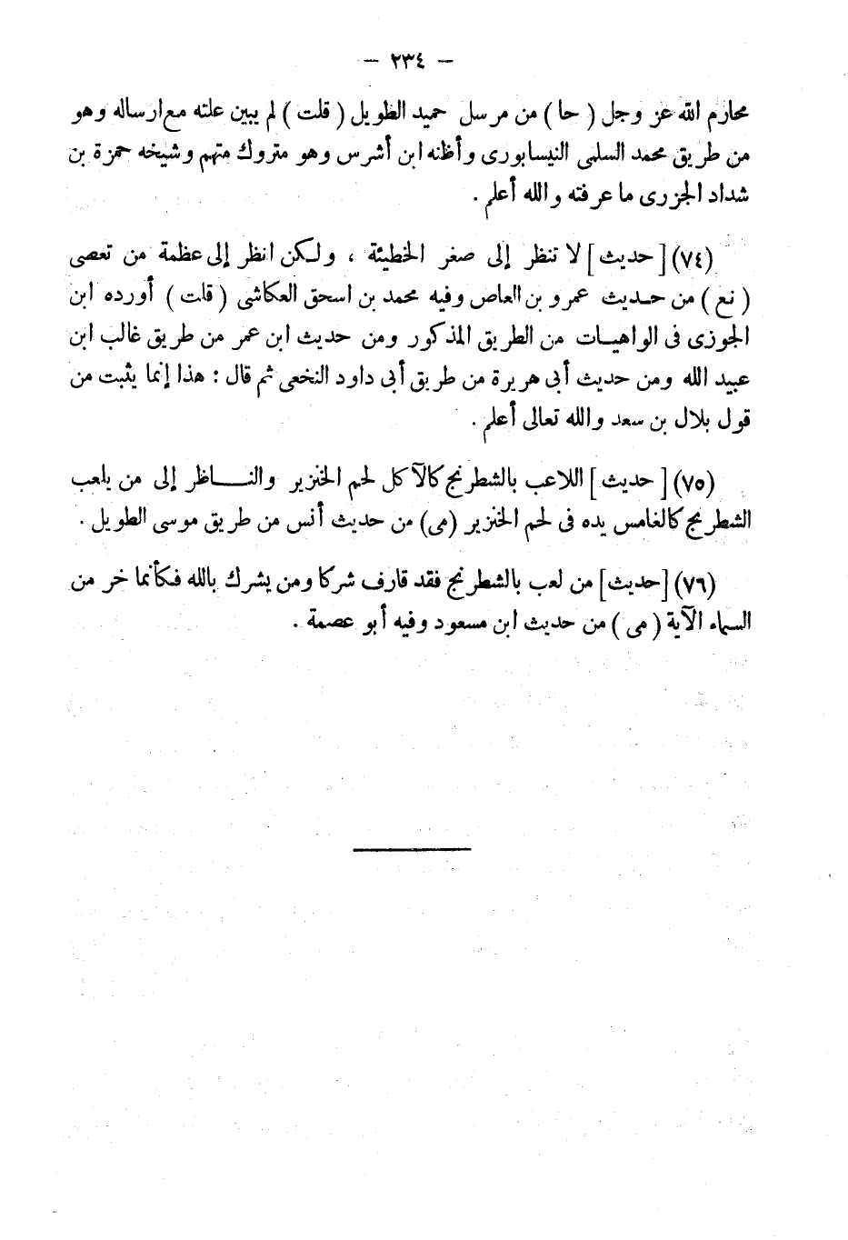 (75) [حَدِيثٌ] اللاعِبُ بِالشَّطْرَنْجِ كَالآكِلِ لَحْمَ الْخِنْزِيرِ وَالنَّاظِرُ إِلَى مَنْ يَلْعَبُ الشَّطْرَنْجَ كَالْغَامِسِ يَدَهُ فِي لَحْمِ الْخِنْزِيرِ (مي) مِنْ حَدِيثِ أَنَسٍ مِنْ طَرِيق مُوسَى الطَّوِيل.