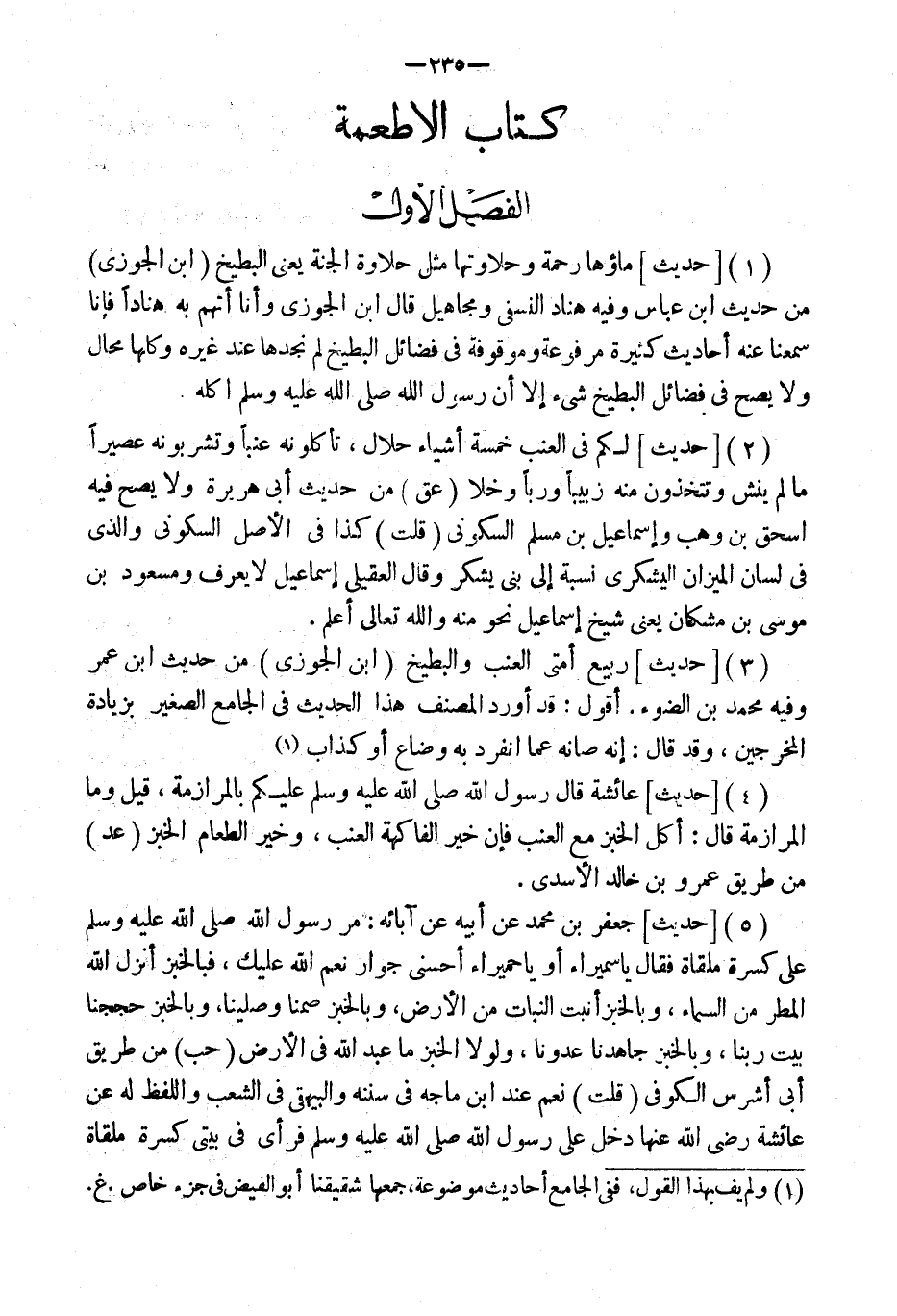 (1) [حَدِيثٌ] مَاؤُهَا رَحْمَةٌ وَحَلاوَتُهَا مِثْلُ حَلاوَةِ الْجَنَّةِ يَعْنِي الْبِطِّيخَ (ابْن الْجَوْزِيّ) من حَدِيث ابْن عَبَّاس وَفِيه هناد النَّسَفِيّ ومجاهيل قَالَ ابْن الْجَوْزِيّ وَأَنا أتهم بِهِ هنادا فَإنَّا سمعنَا عَنهُ أَحَادِيث كَثِيرَة مَرْفُوعَة مَوْقُوفَة فِي فَضَائِل الْبِطِّيخ لم نجدها عِنْد غَيره وَكلهَا محَال وَلَا يَصح فِي فَضَائِل الْبِطِّيخ شَيْء إِلَّا أَن رَسُول الله أكله.