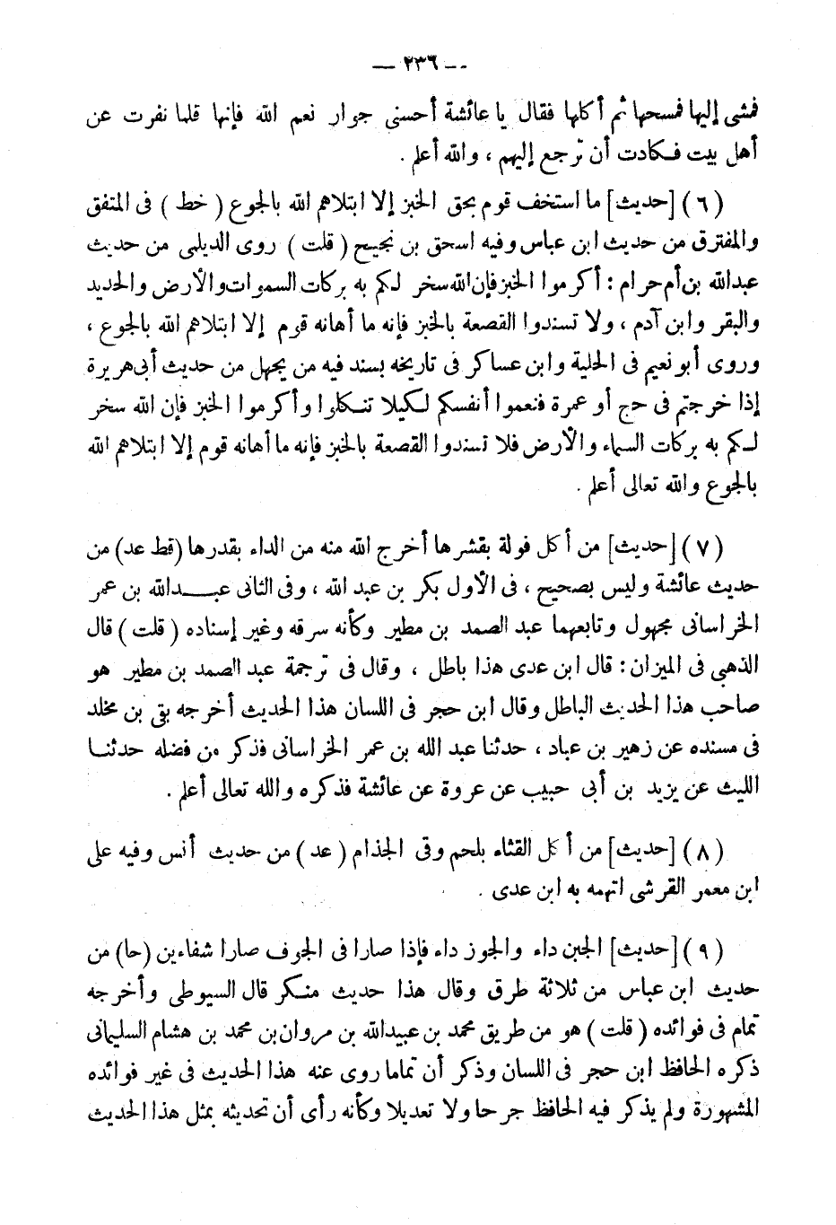 (7) [حَدِيثٌ] مَنْ أَكَلَ فُولَةً بِقِشْرِهَا أَخْرَجَ اللَّهُ مِنْهُ مِنَ الدَّاءِ بِقَدْرِهَا (قَطُّ عد) من حَدِيث عَائِشَة وَلَيْسَ بِصَحِيح، فِي الأول بكر بن عبد الله، وَفِي الثَّانِي عبد الله بن عمر الْخُرَاسَانِي مَجْهُول وتابعهما عبد الصَّمد بن مطير وَكَأَنَّهُ سَرقه وَغير إِسْنَاده (قلت) قَالَ الذَّهَبِيّ فِي الْمِيزَان: قَالَ ابْنُ عَدِيٍّ هَذَا بَاطِلٌ، وَقَالَ فِي تَرْجَمَة عبد الصَّمد بن مطير هُوَ صَاحب هَذَا الحَدِيث الْبَاطِل وَقَالَ ابْن حجر فِي اللِّسَان هَذَا الحَدِيث أخرجه بَقِي بن مخلد فِي مُسْنده عَن زُهَيْر بن عباد، حَدثنَا عبد الله بن عمر الْخُرَاسَانِي فَذكر من فَضله حَدثنَا اللَّيْث عَن يزِيد بن أبي حبيب عَن عُرْوَة عَن عَائِشَة فَذكره وَالله تَعَالَى أعلم.