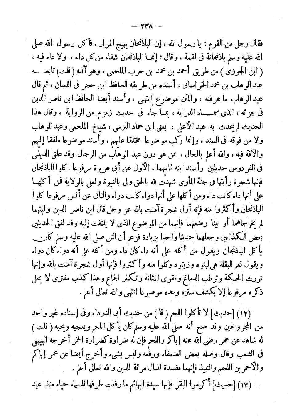 فَأكل رَسُول الله بَاذِنْجَانَةً فِي لُقْمَةٍ، وَقَالَ: إِنَّمَا الْبَاذِنْجَانُ شِفَاءٌ مِنْ كُلِّ دَاءٍ، وَلا دَاءَ فِيهِ، (ابْن الْجَوْزِيّ) من طَرِيق أَحْمد بن مُحَمَّد بن حَرْب الملحمي، وَهُوَ آفته (قلت) تَابعه عبد الْوَهَّاب بن مُحَمَّد الْخُرَاسَانِي، أسْندهُ من طَرِيقه الْحَافِظ ابْن حجر فِي اللِّسَان، ثمَّ قَالَ عبد الْوَهَّاب مَا عَرفته، والمتن مَوْضُوع انْتهى، وَأسْندَ أَيْضا الْحَافِظ ابْن نَاصِر الدَّين فِي جزئه، الَّذِي سَمَّاهُ الدِّرَايَة، بِمَا جَاءَ فِي حَدِيث زَمْزَم من الرِّوَايَة، وَقَالَ هَذَا الحَدِيث لم يحدث بِهِ عبد الْأَعْلَى، يَعْنِي ابْن حَمَّاد النَّرْسِي، شيخ الملحمي وَعبد الْوَهَّاب وَلَا من فَوْقه فِي السَّنَد، وَإِنَّمَا ركب مَوْضُوعا مختلقا عَلَيْهِم، وَأسْندَ مَوْضُوعا مُلَفقًا إِلَيْهِم والآفة فِيهِ، وَالله أعلم بِالْحَال، مِمَّن هُوَ دون عبد الْوَهَّاب من الرِّجَال وَقد علق الديلمي فِي الفردوس حديثين وَأسْندَ ابْنه ثَانِيهمَا، الأول عَن أبي هُرَيْرَة مَرْفُوعا.
