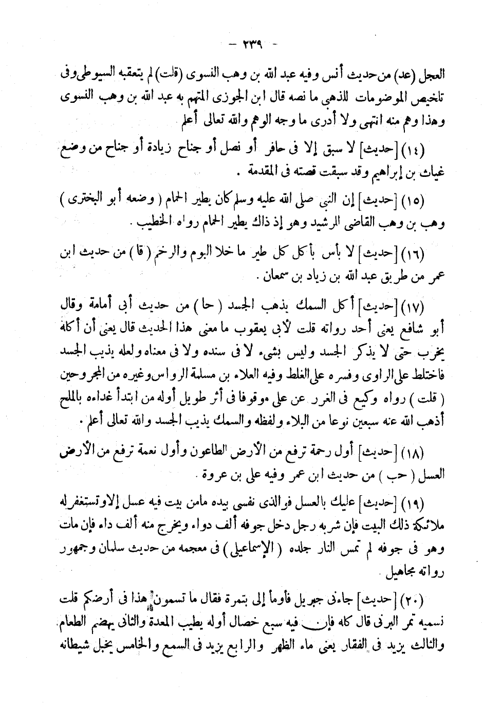 (19) [حَدِيثٌ] عَلَيْكَ بِالْعَسَلِ فَوَالَّذِي نَفْسِي بِيَدِهِ مَا مِنْ بَيْتٍ فِيهِ عَسَلٍ إِلا وَتَسْتَغْفِرُ لَهُ مَلائِكَةُ ذَلِكَ الْبَيْتِ فَإِنْ شَرِبَهُ رَجُلٌ دَخَلَ جَوْفَهُ أَلْفُ دَوَاءٍ وَيَخْرُجُ مِنْهُ أَلْفُ دَاءٍ فَإِنْ مَاتَ وَهُوَ فِي جَوْفِهِ لَمْ تَمَسَّ النَّارُ جِلْدَهُ (الْإِسْمَاعِيلِيّ) فِي مُعْجَمه من حَدِيث سلمَان وَجُمْهُور رُوَاته مَجَاهِيل.