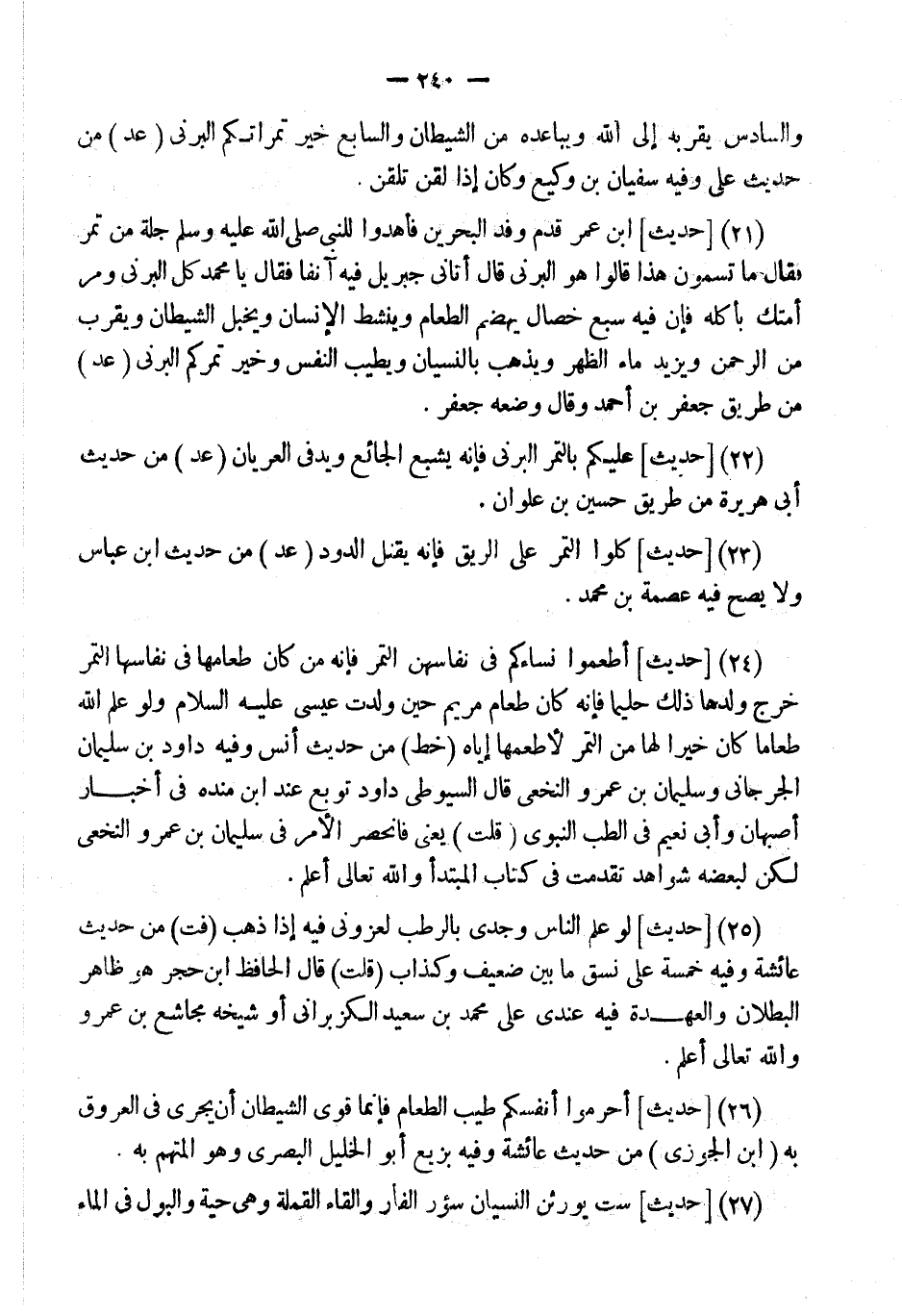 (25) [حَدِيثٌ] لَوْ عَلِمَ النَّاسُ وَجْدِي بِالرُّطَبِ لَعَزَّوْنِي فِيهِ إِذَا ذَهَبِ (فت) من حَدِيث عَائِشَة وَفِيه خَمْسَة على نسق مَا بَين ضَعِيف وَكَذَّاب (قلت) قَالَ الْحَافِظ ابْن حجر هُوَ ظَاهر الْبطلَان والعهدة فِيهِ عِنْدِي على مُحَمَّد بن سعيد الكزبراني أَو شَيْخه مجاشع بن عَمْرو وَالله تَعَالَى أعلم.