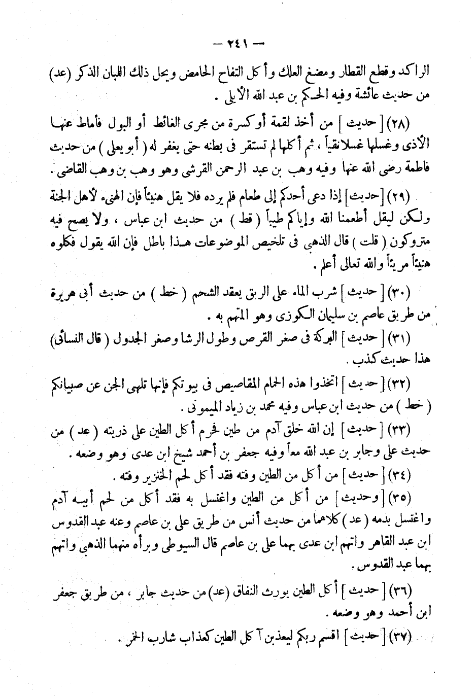 (35) [وَحَدِيثٌ] مَنْ أَكَلَ مِنَ الطِّينِ وَاغْتَسَلَ بِهِ فَقَدْ أَكَلَ لَحْمَ أَبِيهِ آدَمَ وَاغْتَسَلَ بِدَمِهِ (عد) كِلَاهُمَا من حَدِيث أنس من طَرِيق عَليّ بن عَاصِم وَعنهُ عبد القدوس ابْن عبد القاهر واتهم ابْن عدي بهما عَليّ بن عَاصِم قَالَ السُّيُوطِيّ وبرأه مِنْهُمَا الذَّهَبِيّ واتهم بهما عبد القدوس.
