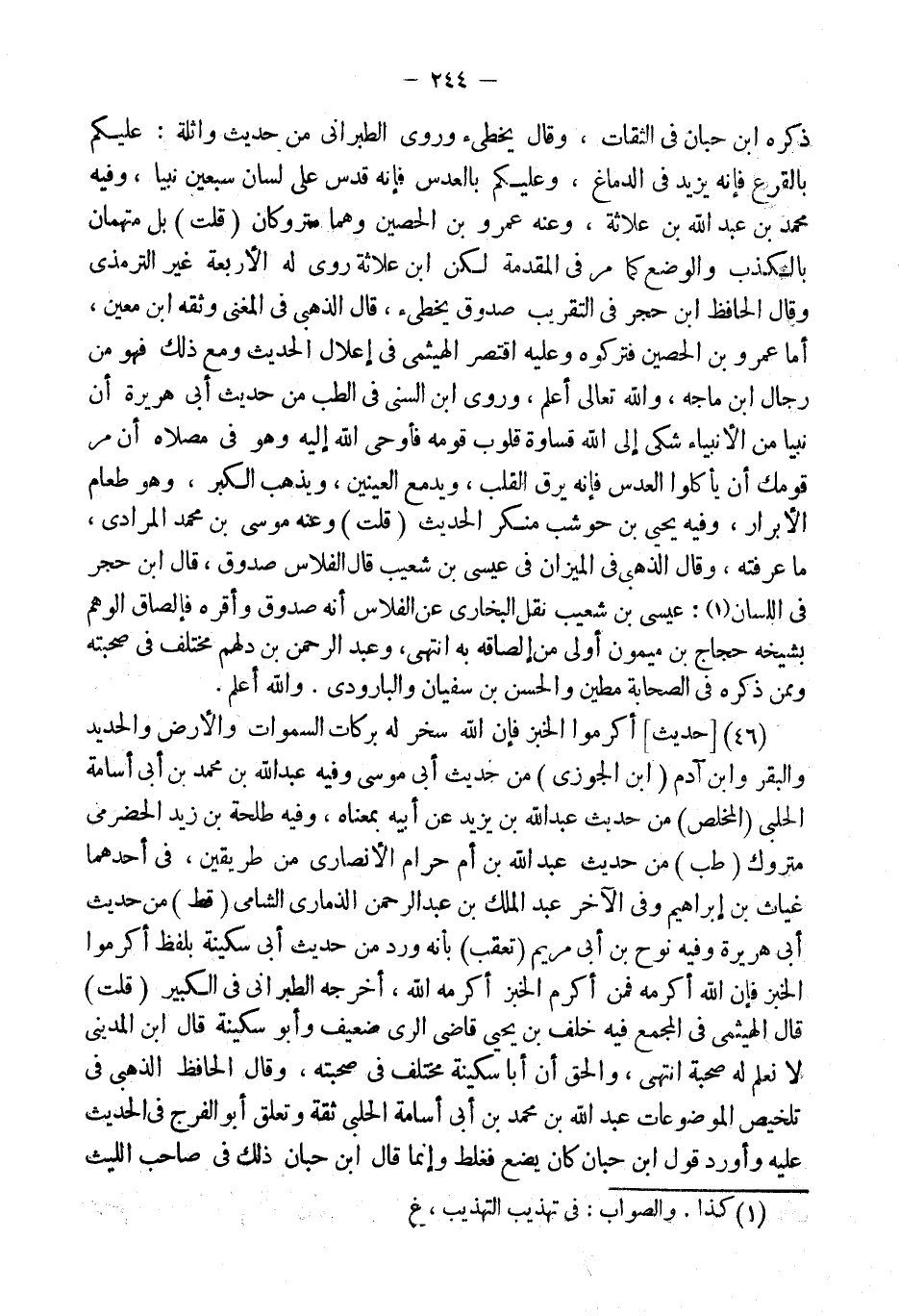 ذكره ابْن حبَان فِي الثِّقَات، وَقَالَ يُخطئ وروى الطَّبَرَانِيّ من حَدِيث وَاثِلَة: عَلَيْكُم بالقرع فَإِنَّهُ يزِيد فِي الدِّمَاغ، وَعَلَيْكُم بالعدس فَإِنَّهُ قدس على لِسَان سبعين نَبيا، وَفِيه مُحَمَّد بن عبد الله بن علاثة، وَعنهُ عَمْرو بن الْحصين وهما مَتْرُوكَانِ (قلت) بل متهمان بِالْكَذِبِ والوضع كَمَا مر فِي الْمُقدمَة لَكِن ابْن علاثة روى لَهُ الْأَرْبَعَة غير التِّرْمِذِيّ وَقَالَ الْحَافِظ ابْن حجر فِي التَّقْرِيب صَدُوق يُخطئ، قَالَ الذَّهَبِيّ فِي الْمُغنِي وَثَّقَهُ ابْن معِين، أما عَمْرو بن الْحصين فَتَرَكُوهُ وَعَلِيهِ اقْتصر الهيثمي فِي إعلال الحَدِيث وَمَعَ ذَلِك فَهُوَ من رجال ابْن مَاجَه، وَالله تَعَالَى أعلم، وروى ابْن السّني فِي الطِّبّ من حَدِيث أبي هُرَيْرَة أَن نَبيا من الْأَنْبِيَاء شكى إِلَى الله قساوة قُلُوب قومه فَأوحى الله إِلَيْهِ وَهُوَ فِي مُصَلَّاهُ أَن مر قَوْمك أَن يَأْكُلُوا العدس فَإِنَّهُ يرق الْقلب، ويدمع الْعَينَيْنِ، وَيذْهب الْكبر، وَهُوَ طَعَام الْأَبْرَار، وَفِيه يحيى بن حَوْشَب مُنكر الحَدِيث (قلت) وَعنهُ مُوسَى بن مُحَمَّد الْمرَادِي، مَا عَرفته، وَقَالَ الذَّهَبِيّ فِي الْمِيزَان فِي عِيسَى بن شُعَيْب قَالَ الفلاس صَدُوق، قَالَ ابْن حجر فِي اللِّسَان: عِيسَى بن شُعَيْب نقل البُخَارِيّ عَن الفلاس أَنه صَدُوق وَأقرهُ فإلصاق الْوَهم بشيخه حجاج بن مَيْمُون أولى من إلصاقه بِهِ انْتهى، وَعبد الرَّحْمَن بن دلهم مُخْتَلف فِي صحبته وَمِمَّنْ ذكره فِي الصَّحَابَة مطين وَالْحسن بن سُفْيَان والبارودي.