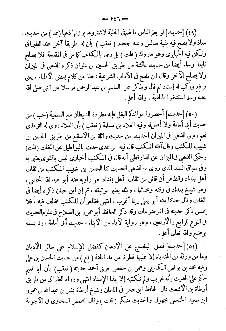 (50) [حَدِيثٌ] أَحْضِرُوا مَوَائِدَكُمُ الْبَقْلَ فَإِنَّهُ مَطْرَدَةٌ لِلشَّيْطَانِ مَعَ التَّسْمِيَةِ (حب) من حَدِيث أبي أُمَامَة وَلَا أصل لَهُ وَفِيه الْعَلَاء بن مسلمة (تعقب) بِأَن الْعَلَاء روى لَهُ التِّرْمِذِيّ نعم روى الذَّهَبِيّ فِي الْمِيزَان الحَدِيث من حَدِيث وَاثِلَة بن الْأَسْقَع من طَرِيق الْحسن بن شبيب الْمكتب وَقَالَ آفته الْمكتب قَالَ فِيهِ ابْن عدي حدث بِالْبَوَاطِيل عَن الثِّقَات (قلت) وَحكى الذَّهَبِيّ فِي الْمِيزَان عَن الدَّارَقُطْنِيّ أَنه قَالَ فِي الْمكتب أَخْبَارِيٌّ لَيْسَ بِالْقَوِيِّ يُعْتَبَرُ بِهِ وَفِي سِيَاق السَّنَد الَّذِي روى بِهِ الذَّهَبِيّ الحَدِيث ثَنَا الْحسن بْنُ شَبِيبٍ الْمُكْتِبُ مِنْ ثِقَاتِ أَهْلِ بَغْدَادَ وَالظَّاهِرُ أَنَّ قَائِلَ مِنْ ثِقَاتِ أَهْلِ بَغْدَادَ هُوَ رَاوِيه عَنهُ أَبُو عبد الله الْمَحَامِلِيُّ، وَهُوَ شَيْخُ بَغْدَادَ فِي وَقْتِهِ وَمُحَدِّثُهَا، وَمِثْلُهُ يُعْتَبَرُ تَوْثِيقُهُ، ثمَّ إِن ابْن حبَان ذكره أَيْضا فِي الثِّقَات وَقَالَ حَدثنَا عَنهُ أَبُو يعلى رُبمَا أغرب، انْتهى فَظَاهر أَن الْمكتب مُخْتَلف فِيهِ، فَلَا يحسن ذكر حَدِيثه فِي الموضوعات وَقد ذكر الْحَافِظ أَبُو عَمْرو بن الصّلاح فِي عُلُوم الحَدِيث فِي النَّوْع الرَّابِع وَالْأَرْبَعِينَ، وَهُوَ رِوَايَة الْآبَاء عَن الْأَبْنَاء، حَدِيث أبي أُمَامَة، وَلم يسمه بِوَضْع وَالله تَعَالَى أعلم.
