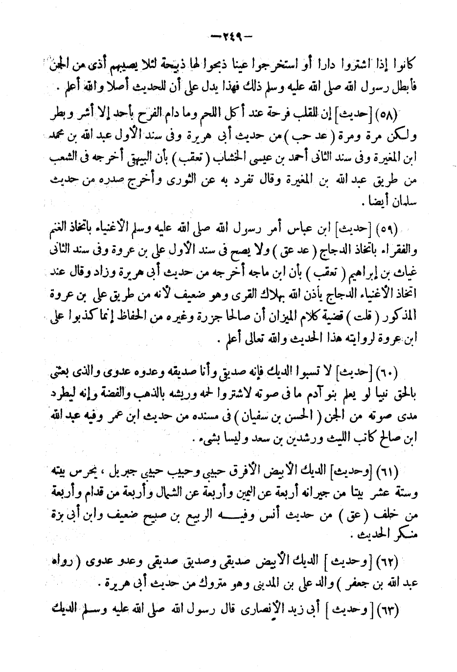 (59) [حَدِيثُ] ابْنِ عَبَّاسٍ أَمَرَ رَسُول الله الأَغْنِيَاءَ بِاتِّخَاذِ الْغَنَمِ وَالْفُقَرَاءَ بِاتِّخَاذِ الدَّجَاجِ (عد عق) وَلَا يَصح فِي سَنَد الأول عَليّ بن عُرْوَة وَفِي سَنَد الثَّانِي غياث بن إِبْرَاهِيم (تعقب) بِأَن ابْن مَاجَه أخرجه من حَدِيث أبي هُرَيْرَة وَزَاد وَقَالَ عِنْد اتِّخَاذ الْأَغْنِيَاء الدَّجَاج يَأْذَن الله بِهَلَاك الْقرى وَهُوَ ضَعِيف لِأَنَّهُ من طَرِيق عَليّ بن عُرْوَة الْمَذْكُور (قلت) قَضِيَّة كَلَام الْمِيزَان أَن صَالحا جزرة وَغَيره من الْحفاظ إِنَّمَا كذبُوا عَليّ ابْن عُرْوَة لروايته هَذَا الحَدِيث وَالله تَعَالَى أعلم.