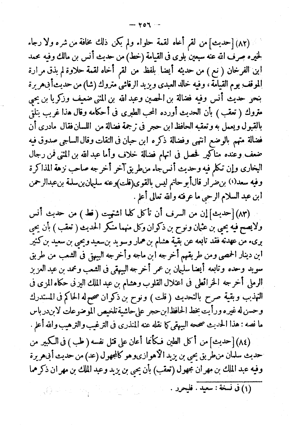 (83) [حَدِيثٌ] إِنَّ مِنَ السَّرَفِ أَنْ تَأْكُلَ كُلَّمَا اشْتَهَيْتَ (قطّ) من حَدِيث أنس وَلا يَصِحُّ فِيهِ يَحْيَى بْنُ عُثْمَان ونوح بن ذكْوَان وكل مِنْهُمَا مُنكر الحَدِيث (تعقب) بِأَن يحيى بَرِيء من عهدته فقد تَابعه عَن بَقِيَّة هِشَام بن عمار وسُويد بن سعيد وَيحيى بن سعيد بن كثير ابْن دِينَار الْحِمصِي وَمن طريقهم أخرجه ابْن مَاجَه وَأخرجه الْبَيْهَقِيّ فِي الشّعب من طَرِيق سُوَيْد وَحده وَتَابعه أَيْضا سُلَيْمَان بن عمر أخرجه الْبَيْهَقِيّ فِي الشّعب وَمُحَمّد بن عبد الْعَزِيز الرَّمْلِيّ أخرجه الخرائطي فِي اعتلال الْقُلُوب وَهِشَام بن عبد الْملك الْيَزنِي حَكَاهُ الْمزي فِي التَّهْذِيب وَبَقِيَّة صرح بِالتَّحْدِيثِ (قلت) ونوح بن ذكْوَان صحّح لَهُ الْحَاكِم فِي الْمُسْتَدْرك وَحسن لَهُ غَيره وَرَأَيْت بِخَط الْحَافِظ ابْن حجر على حَاشِيَة تَلْخِيص الموضوعات لِابْنِ درباس مَا نَصه: هَذَا الحَدِيث صَححهُ الْبَيْهَقِيّ كَمَا نَقله عَنهُ الْمُنْذِرِيّ فِي التَّرْغِيب والترهيب وَالله أعلم.