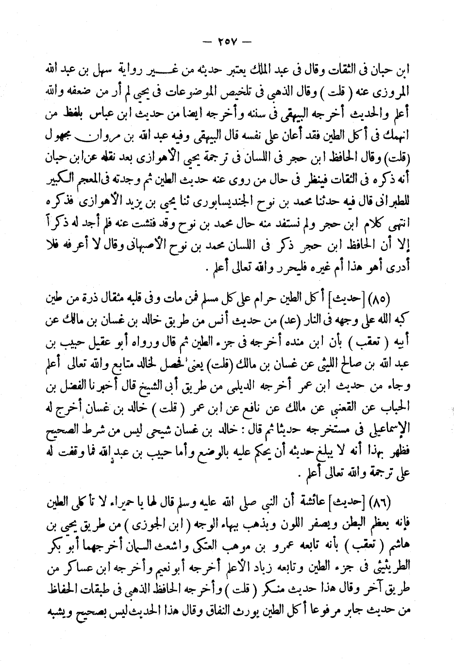 (85) [حَدِيثٌ] أَكْلُ الطِّينِ حَرَامٌ عَلَى كُلِّ مُسْلِمٍ فَمَنْ مَاتَ وَفِي قَلْبِهِ مِثْقَالُ ذَرَّةٍ مِنْ طِينٍ كَبَّهُ اللَّهُ عَلَى وَجْهِهِ فِي النَّارِ (عد) من حَدِيث أنس من طَرِيق خَالِد بن غَسَّان بن مَالك عَن أَبِيه (تعقب) بِأَن ابْن مَنْدَه أخرجه فِي جُزْء الطين ثمَّ قَالَ وَرَوَاهُ أَبُو عقيل حبيب بن عبد الله بن صَالح اللَّيْثِيّ عَن غَسَّان بن مَالك (قلت) يَعْنِي فَحصل لخَالِد متابع وَالله تَعَالَى أعلم وَجَاء من حَدِيث ابْن عمر أخرجه الديلمي من طَرِيق أبي الشَّيْخ قَالَ أخبرنَا الْفضل بن الْحباب عَن القعْنبِي عَن مَالك عَن نَافِع عَن ابْن عمر (قلت) خَالِد بن غَسَّان أخرج لَهُ الْإِسْمَاعِيلِيّ فِي مستخرجه حَدِيثا ثمَّ قَالَ: خَالِد بن غَسَّان شيحى لَيْسَ من شَرط الصَّحِيح فَظهر بِهَذَا أَنه لَا يبلغ حَدِيثه أَن يحكم عَلَيْهِ بِالْوَضْعِ وَأما حبيب بن عبد الله فَمَا وقفت لَهُ على تَرْجَمَة وَالله تَعَالَى أعلم.