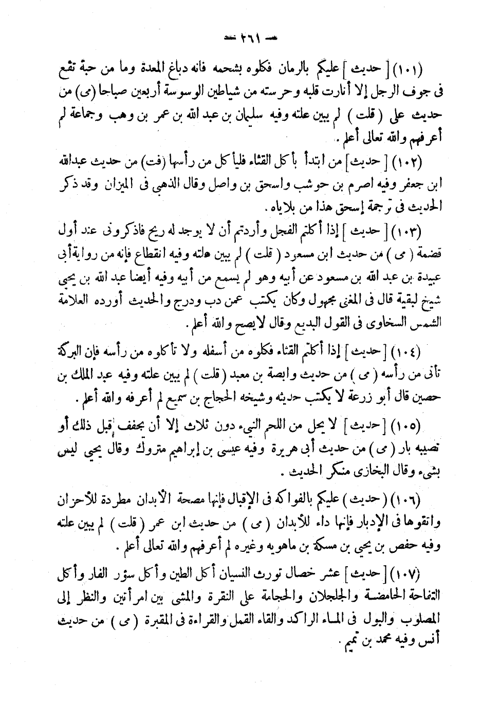 (103) [حَدِيثٌ] إِذَا أَكَلْتُمُ الْفُجْلَ وَأَرَدْتُمْ أَنْ لَا يُوجَدَ لَهُ رِيحٌ فَاذْكُرُونِي عِنْدَ أَوَّلِ قَضْمَةٍ (مي) من حَدِيث ابْن مَسْعُود (قلت) لم يبين علته وَفِيه انْقِطَاع فَإِنَّهُ من رِوَايَة أبي عُبَيْدَة بن عبد الله بن مَسْعُود عَن أَبِيه وَهُوَ لم يسمع من أَبِيه وَفِيه أَيْضا عبد الله بن يحيى شيخ لبَقيَّة قَالَ فِي الْمُغنِي مَجْهُول وَكَانَ يكْتب عَمَّن دب ودرج والْحَدِيث أوردهُ الْعَلامَة الشَّمْس السخاوي فِي القَوْل البديع وَقَالَ لَا يَصح وَالله أعلم.