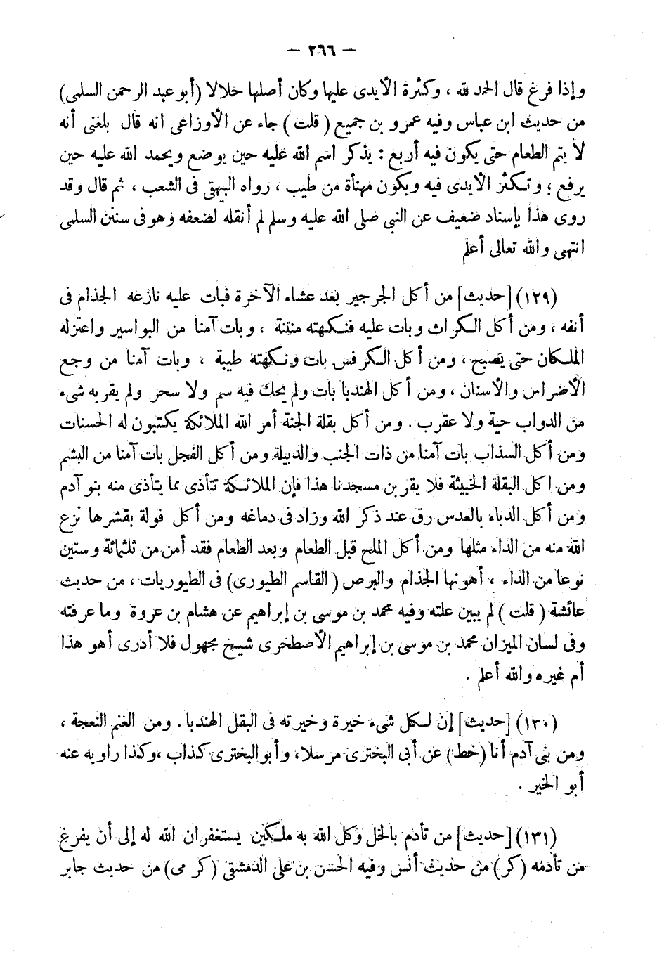 وَمَنْ أَكَلَ بَقْلَةَ الْجَنَّةِ أَمَرَ اللَّهُ الْمَلائِكَةَ يَكْتُبُونَ لَهُ الْحَسَنَاتِ وَمَنْ أَكَلَ السَّذَابَ بَاتَ آمِنًا مِنْ ذَاتِ الْجَنْبِ وَالدُّبَيْلَةِ وَمَنْ أَكَلَ الْفُجْلَ بَاتَ آمِنًا مِنَ الْبَشَمِ وَمَنْ أَكَلَ الْبَقْلَةِ الْخَبِيثَةِ فَلا يَقْرَبَنَّ مَسْجِدَنَا هَذَا فَإِنَّ الْمَلائِكَةَ تَتَأَذَّى مِمَّا يَتَأَذَّى مِنْهُ بَنُو آدَمَ وَمَنْ أَكَلَ الدُّبَّاءَ بِالْعَدَسِ رَقَّ عِنْدَ ذِكْرِ اللَّهِ وَزَادَ فِي دِمَاغِهِ وَمَنْ أَكَلَ فُولَةً بِقِشْرِهَا نَزَعَ اللَّهُ مِنْهُ مِنَ الدَّاءِ مِثْلَهَا وَمَنْ أَكَلَ الْمِلْحَ قَبْلَ الطَّعَامِ وَبَعْدَ الطَّعَامِ فَقَدْ أَمن من ثلثمِائة وَسِتِّينَ نوعا من الدَّوَاء، أَهْوَنُهَا الْجُذَامُ وَالْبَرَصُ (الْقَاسِم الطيوري) فِي الطيوريات، من حَدِيث عَائِشَة (قلت) لم يبين علته وَفِيه مُحَمَّد بن مُوسَى بن إِبْرَاهِيم عَن هِشَام بن عُرْوَة وَمَا عَرفته وَفِي لِسَان الْمِيزَان مُحَمَّد بن مُوسَى بن إِبْرَاهِيم الأصطخري شيخ مَجْهُول فَلَا أَدْرِي أهوَ هَذَا أم غَيره وَالله أعلم.