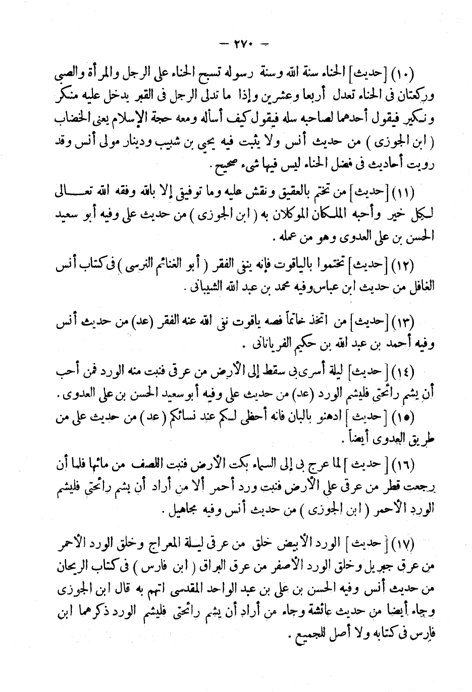 (10) [حَدِيثٌ] الْحِنَّاءُ سُنَّةُ اللَّهِ وَسُنَّةُ رَسُولِهِ تُسَبِّحُ الْحِنَّاءُ عَلَى الرَّجُلِ وَالْمَرْأَةِ وَالصَّبِيِّ وَرَكْعَتَانِ فِي الْحِنَّاءِ تَعْدِلُ أَرْبَعًا وَعِشْرِينَ وَإِذَا مَا تَدَلَّى الرَّجُلُ فِي الْقَبْرِ يَدْخُلُ عَلَيْهِ مُنْكَرٌ وَنَكِيرٌ فَيَقُولُ أَحَدُهُمَا لِصَاحِبِهِ سَلْهُ فَيَقُولُ كَيْفَ أَسْأَلُهُ وَمَعَهُ حُجَّةُ الإِسْلامِ يَعْنِي الْخِضَابِ (ابْن الْجَوْزِيّ) من حَدِيث أنس وَلَا يثبت فِيهِ يحيى بن شبيب ودينار مولى أنس وَقد رويت أَحَادِيث فِي فضل الْحِنَّاء لَيْسَ فِيهَا شَيْء صَحِيح.